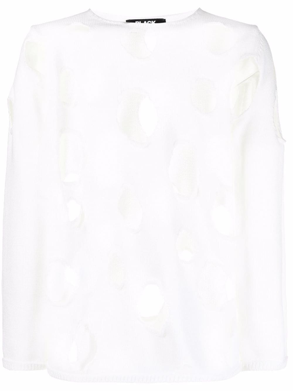 WHITE CUT-OUT HOLE JUMPER FROM BLACK COMME DES GARCONS FEATURING KNITTED CONSTRUCTION, RIBBED DETAILING, CUT-OUT DETAILING, ROUND NECK, LONG SLEEVES AND RAW EDGE.