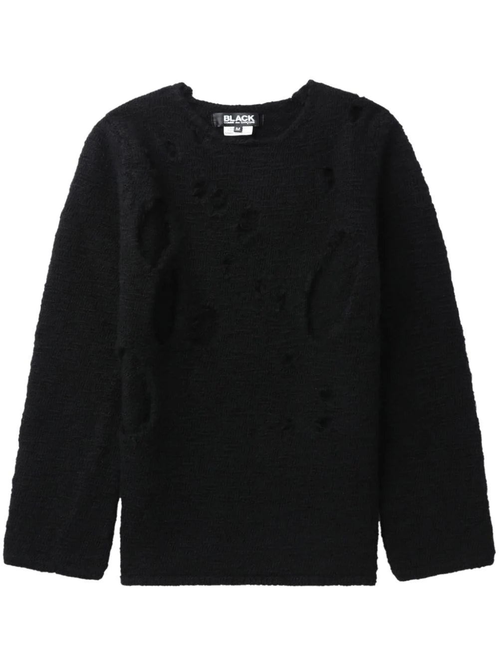 DISTRESSED-EFFECT WOOL JUMPER FROM BLACK COMME DES GARCONS FEATURING BLACK, WOOL, DISTRESSED EFFECT, RIBBED TRIM, CREW NECK, LONG SLEEVES AND STRAIGHT HEM.