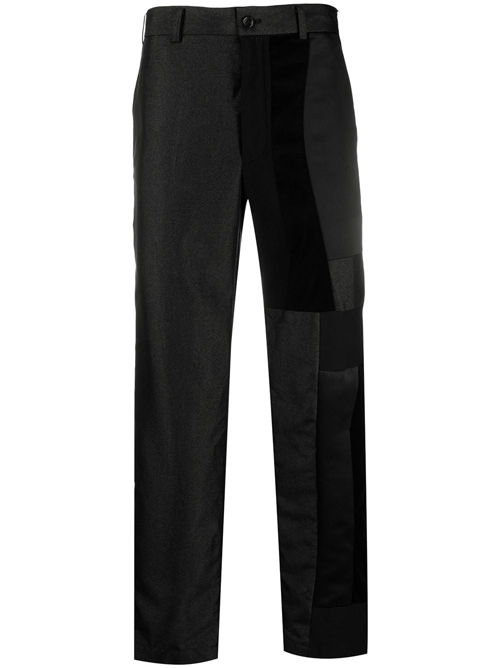 BLACK COTTON PATCHWORK STRAIGHT-LEG TROUSERS FROM BLACK COMME DES GARCONS FEATURING PATCHWORK DESIGN, TWO SIDE INSET POCKETS, BELT LOOPS, FRONT BUTTON FASTENING AND STRAIGHT LEG.