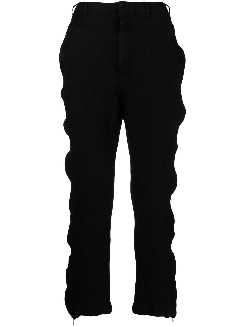 WOOL ZIPPER-TRIM TROUSERS FROM BLACK COMME DES GARCONS FEATURING BLACK, DECORATIVE ZIP DETAILING, BELT LOOPS, FRONT BUTTON AND ZIP FASTENING, TWO SIDE SLASH POCKETS AND CROPPED LEG.