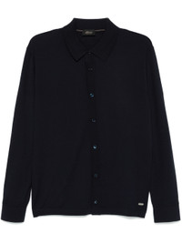 INTRODUCING OUR MIDNIGHT BLUE FINE-KNIT SHIRT! MADE WITH HIGH-QUALITY WOOL, THIS CLASSIC SHIRT FEATURES A FRONT BUTTON FASTENING, A CLASSIC COLLAR, AND LONG SLEEVES WITH BUTTONED CUFFS. THE RIBBED CUFFS AND HEM ADD A TOUCH OF SOPHISTICATION, WHILE THE LOGO PLAQUE ADDS A SUBTLE BRANDING DETAIL. STAY WARM AND STYLISH WITH THIS MUST-HAVE PIECE.