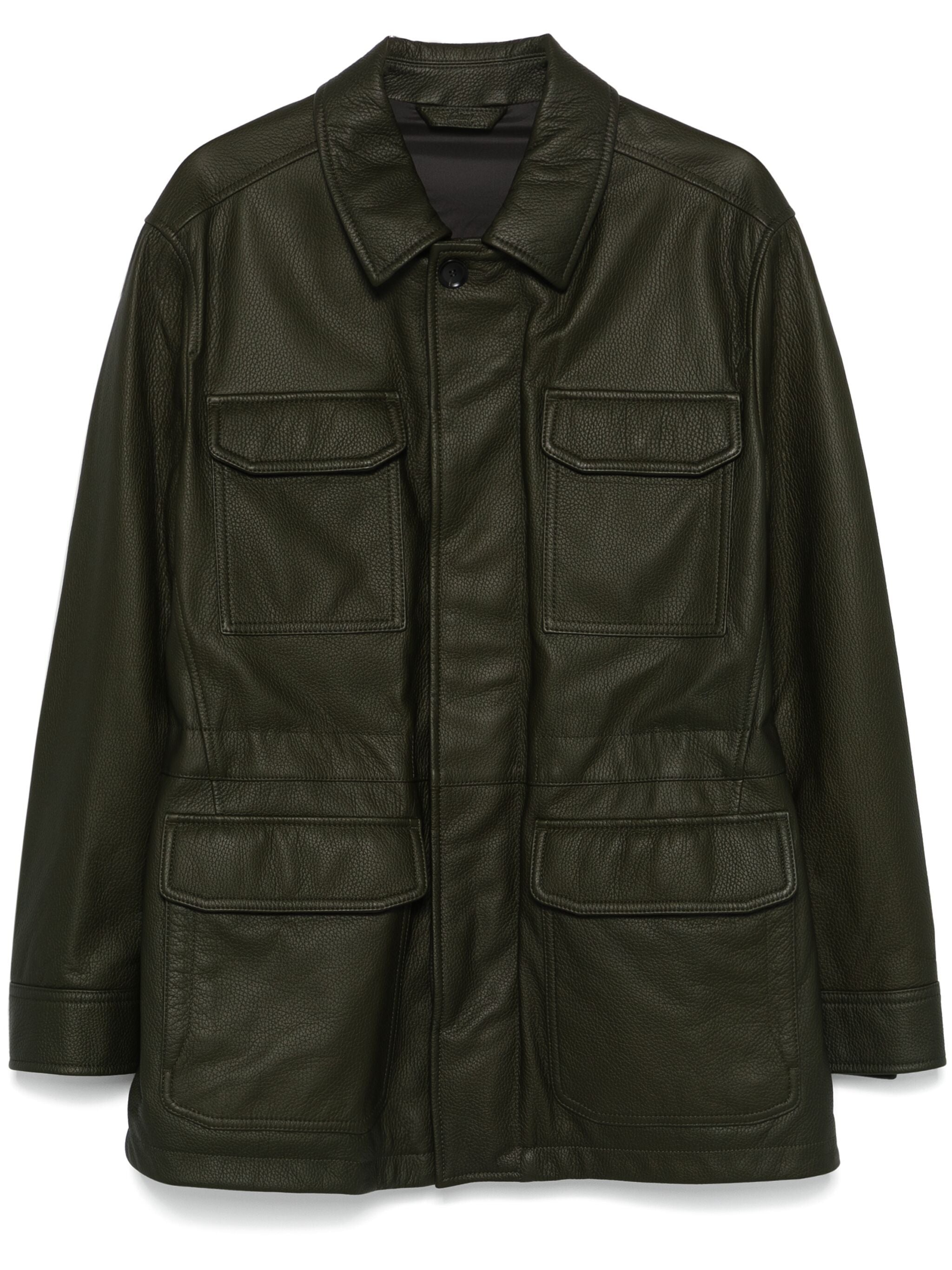 THIS OLIVE GREEN LEATHER SAHARIANA JACKET IS MADE OF DEERSKIN WITH A GRAINED TEXTURE. IT FEATURES A CLASSIC COLLAR, LONG SLEEVES WITH BUTTONED CUFFS, AND A CONCEALED FRONT FASTENING. THE JACKET ALSO HAS FOUR FRONT FLAP POCKETS, TWO SIDE SLIT POCKETS, AND AN INTERNAL DRAWSTRING FASTENING WAIST. WITH ITS FULL LINING AND STRAIGHT HEM, IT'S BOTH STYLISH AND FUNCTIONAL.