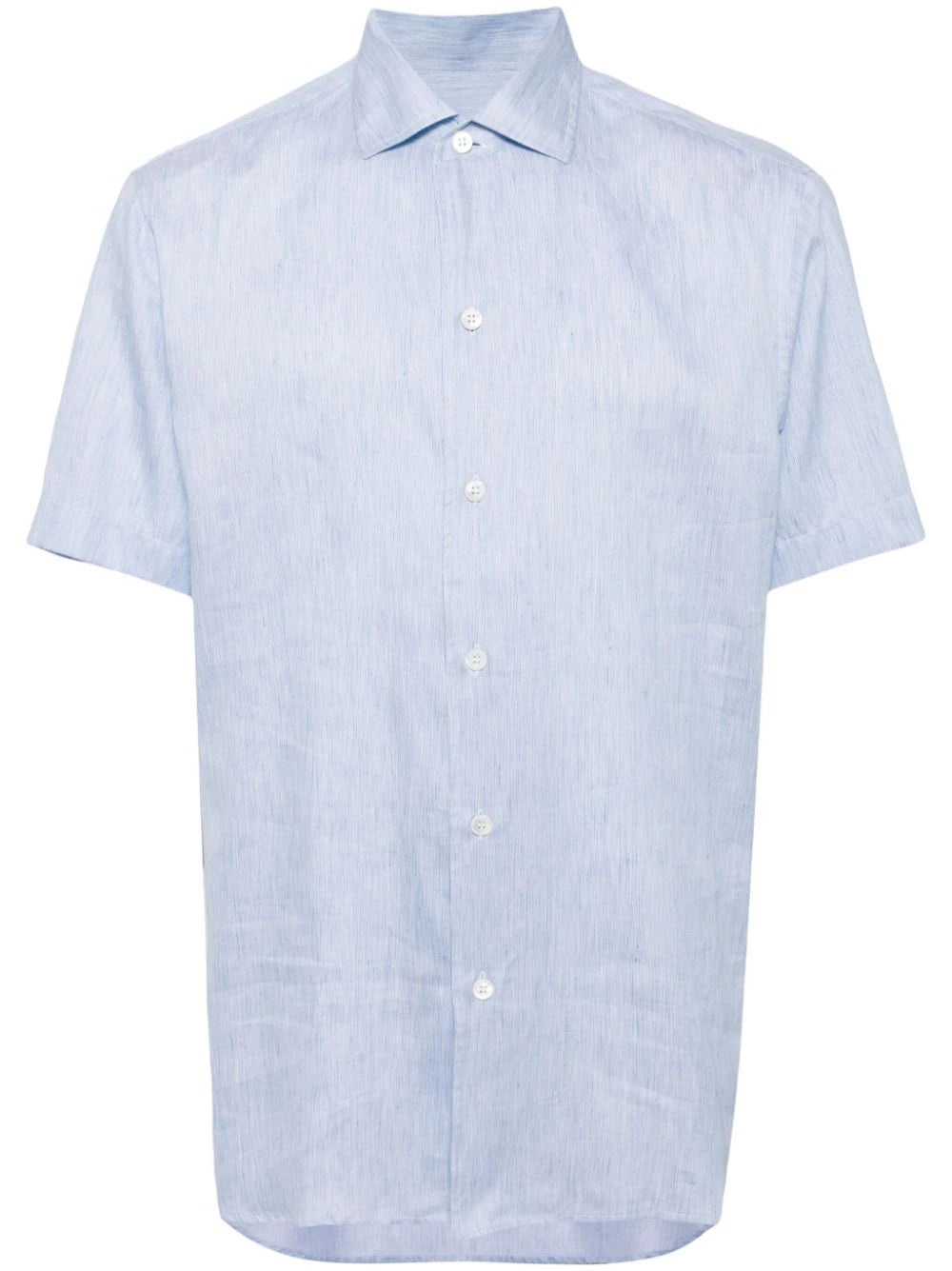 SKY BLUE COTTON BLEND SHORT SLEEVES FRONT BUTTON FASTENING CAMP COLLAR CURVED HEM