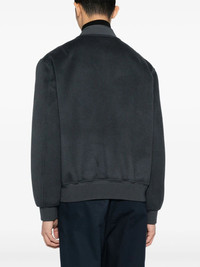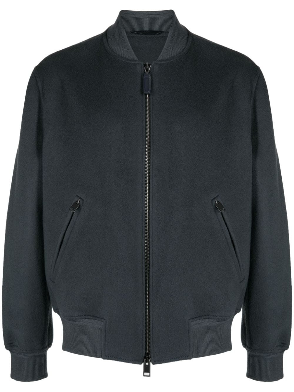 PETROLEUM BLUE WOOL-CASHMERE BLEND RIBBED BAND COLLAR FRONT TWO-WAY ZIP FASTENING LONG SLEEVES LONG SLEEVES TWO ZIP-FASTENING POCKETS INTERNAL ZIP-FASTENING POCKET RIBBED CUFFS AND HEM