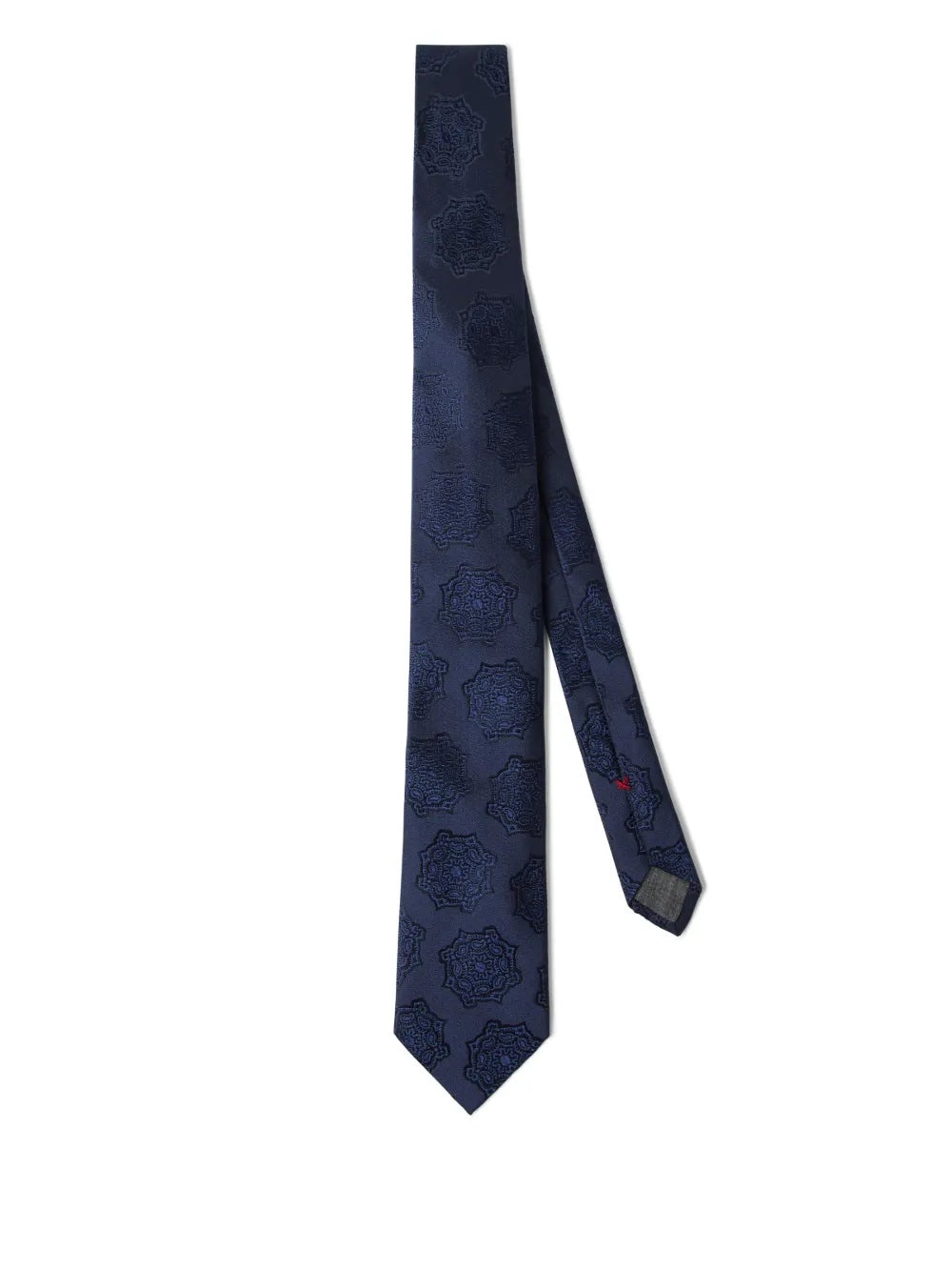 CRAFTED WITH EXPERTLY WOVEN JACQUARD FABRIC, THIS SILK TIE BOASTS A UNIQUE NAVY BLUE PATTERN AND POINTED TIP DESIGN. ELEVATE YOUR FORMAL ATTIRE WITH THIS LUXURIOUS ACCESSORY, PERFECT FOR ADDING A TOUCH OF SOPHISTICATION TO ANY OUTFIT.