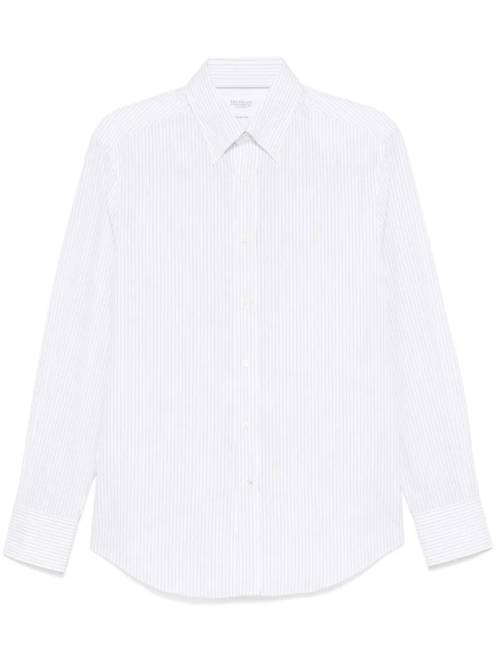 THIS STRIPED SHIRT FEATURES A WHITE AND ANTHRACITE GREY COTTON POPLIN TEXTURE WITH A VERTICAL STRIPE PATTERN. THE FRONT BUTTON FASTENING AND BUTTON-DOWN COLLAR ADD A TOUCH OF SOPHISTICATION, WHILE THE LONG SLEEVES WITH BUTTONED CUFFS AND CURVED HEM PROVIDE A COMFORTABLE AND STYLISH FIT. UPGRADE YOUR WARDROBE WITH THIS VERSATILE AND TRENDY SHIRT.