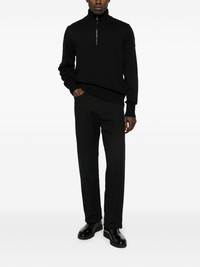 THIS BLACK TURTLENECK SWEATER COMBINES CONTEMPORARY DESIGN WITH PRACTICAL VERSATILITY. THE HALF-ZIP FASTENING ALLOWS EFFORTLESS LAYERING AND TEMPERATURE CONTROL, WHILST LONG SLEEVES PROVIDE COMPREHENSIVE COVERAGE. A SUBTLE LOGO PATCH ADDS BRAND IDENTITY, AND THE RIBBED HEM ENSURES A REFINED, TAILORED FINISH. AN ESSENTIAL PIECE FOR THE MODERN PROFESSIONAL WARDROBE.