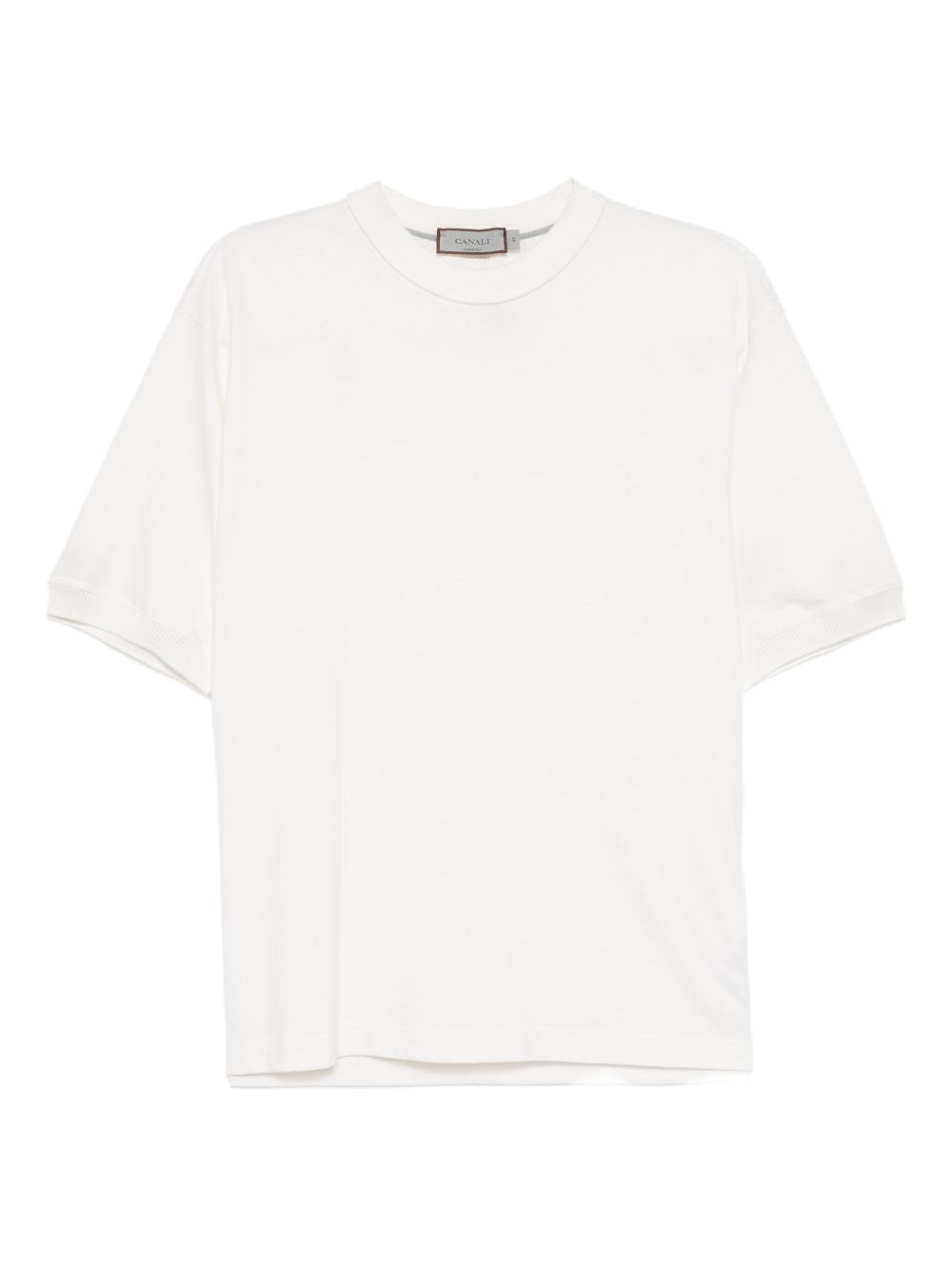 THIS WHITE COTTON T-SHIRT FEATURES A CLASSIC CREW NECK AND SHORT SLEEVES, ENHANCED WITH RIBBED CUFFS FOR A POLISHED FINISH. CRAFTED FOR COMFORT AND DURABILITY, IT OFFERS A VERSATILE FOUNDATION FOR BOTH CASUAL AND LAYERED OUTFITS.