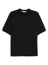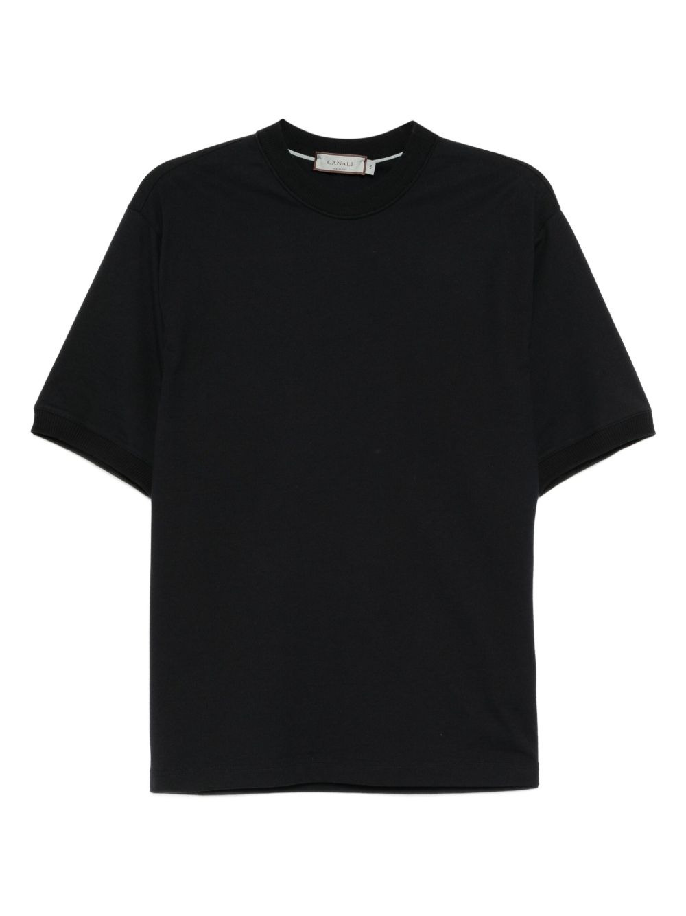 THIS DARK BLUE COTTON T-SHIRT FEATURES A CLASSIC CREW NECK AND SHORT SLEEVES, COMPLEMENTED BY RIBBED CUFFS FOR A REFINED FINISH. ITS BREATHABLE FABRIC ENSURES COMFORT, MAKING IT A VERSATILE ADDITION TO ANY WARDROBE.