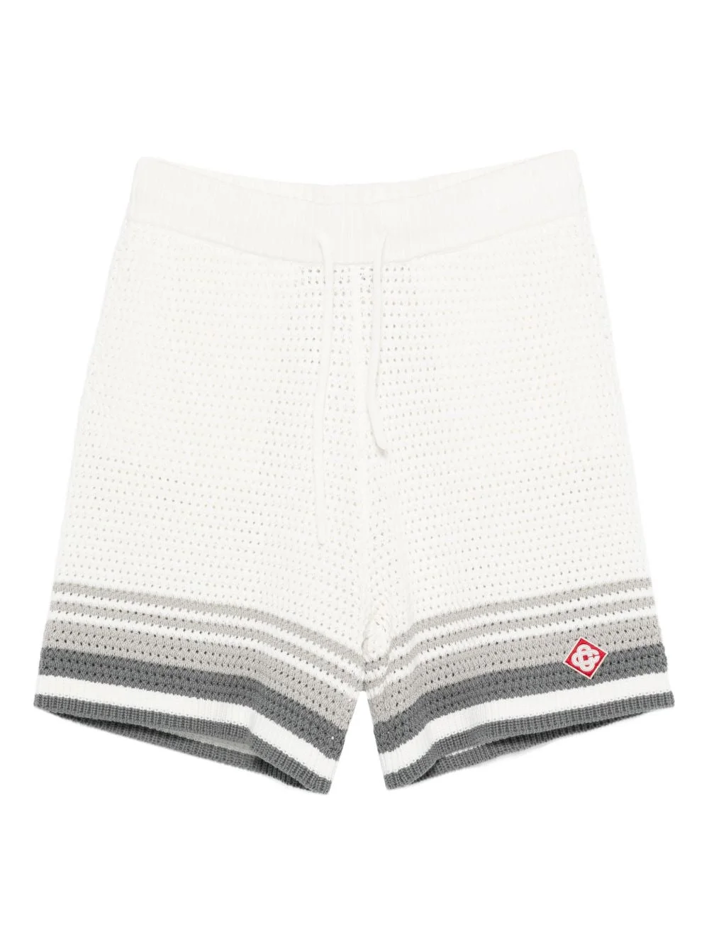 EXPERTLY CRAFTED CROCHET SHORTS FEATURING A REFINED WHITE AND GREY STRIPED PATTERN THAT ADDS VISUAL INTEREST TO YOUR WARM-WEATHER WARDROBE. THE DRAWSTRING FASTENING ENSURES A CUSTOMIZABLE FIT, WHILE THE SIGNATURE LOGO APPLIQUE DELIVERS UNDERSTATED BRAND RECOGNITION. THE INTRICATE CROCHET KNIT CONSTRUCTION OFFERS BREATHABLE COMFORT WITH A SOPHISTICATED TEXTURE THAT ELEVATES CASUAL STYLING. PERFECT FOR THOSE WHO APPRECIATE QUALITY CRAFTSMANSHIP AND CONTEMPORARY DESIGN.