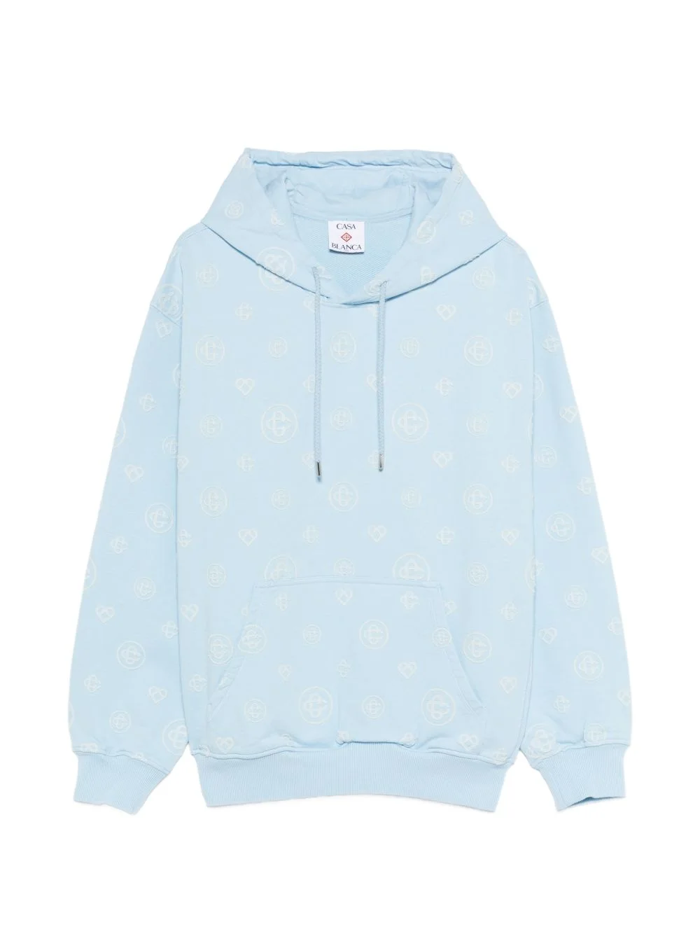 ELEVATE YOUR CASUAL WARDROBE WITH THIS SOPHISTICATED MONOGRAM-APPLIQUE HOODIE. CRAFTED IN A LIGHT BLUE ALL-OVER PATTERN, IT COMBINES COMFORT WITH CONTEMPORARY STYLE. THE DRAWSTRING HOOD OFFERS ADJUSTABLE COVERAGE, WHILE THE KANGAROO POCKET PROVIDES PRACTICAL STORAGE FOR EVERYDAY ESSENTIALS. RIBBED HEMS AND CUFFS ENSURE A REFINED, TAILORED FIT THAT WORKS SEAMLESSLY FROM WEEKEND LOUNGING TO CASUAL OFFICE SETTINGS. PERFECT FOR LAYERING OR WEARING SOLO, THIS HOODIE DELIVERS VERSATILE APPEAL WITH UNDERSTATED ELEGANCE.