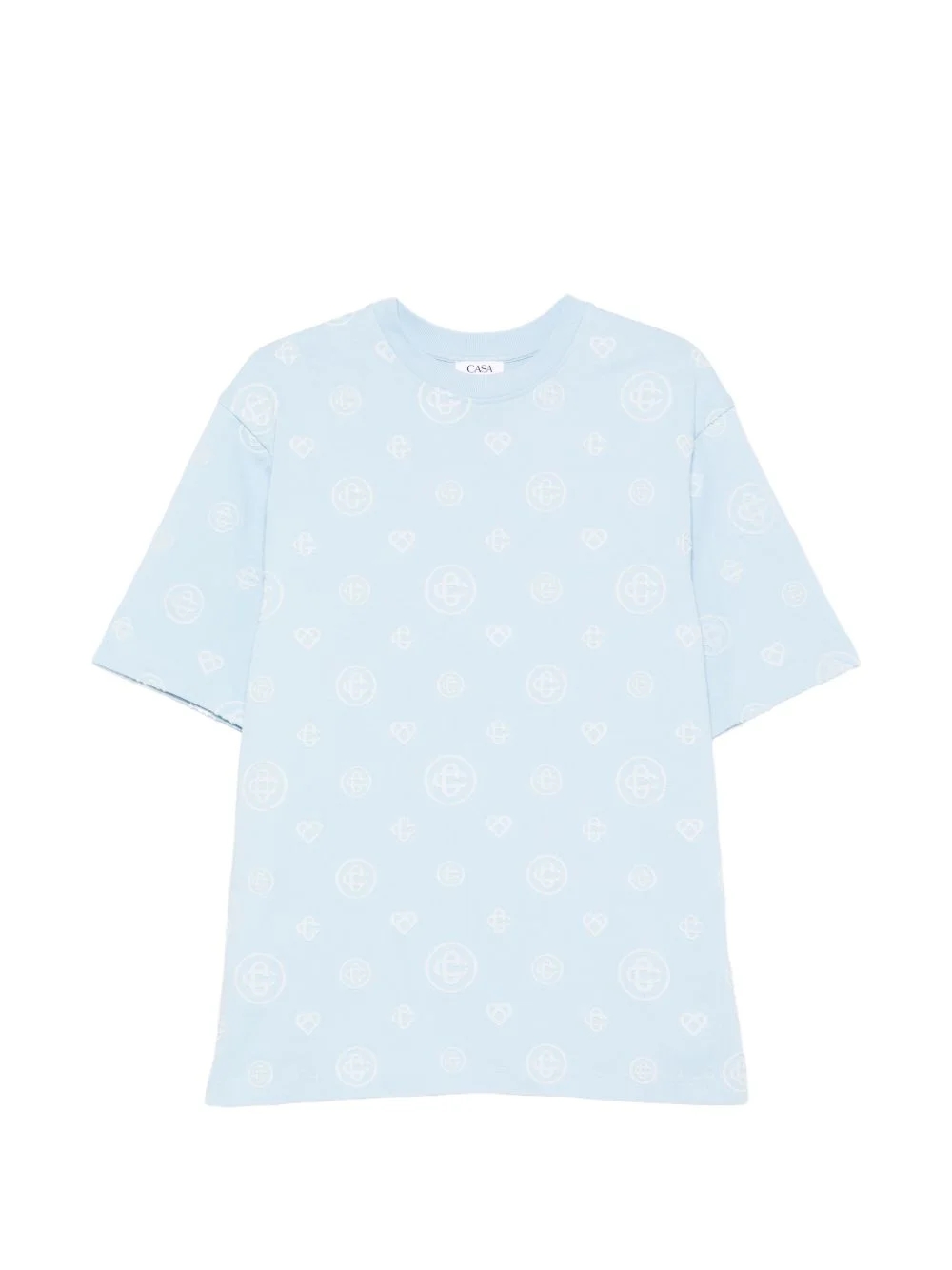 EFFORTLESS STYLE MEETS COMFORT IN THIS OVERSIZED CREW NECK TEE. CRAFTED FROM SOFT ORGANIC COTTON, IT FEATURES A DISTINCTIVE SKY BLUE MONOGRAM PATTERN THAT ADDS CHARACTER TO YOUR EVERYDAY WARDROBE. THE RELAXED FIT AND SHORT SLEEVES MAKE IT PERFECT FOR CASUAL WEAR, LAYERING, OR LOUNGING. A VERSATILE STAPLE THAT WORKS WITH JEANS, SHORTS, OR YOUR FAVOURITE BOTTOMS.