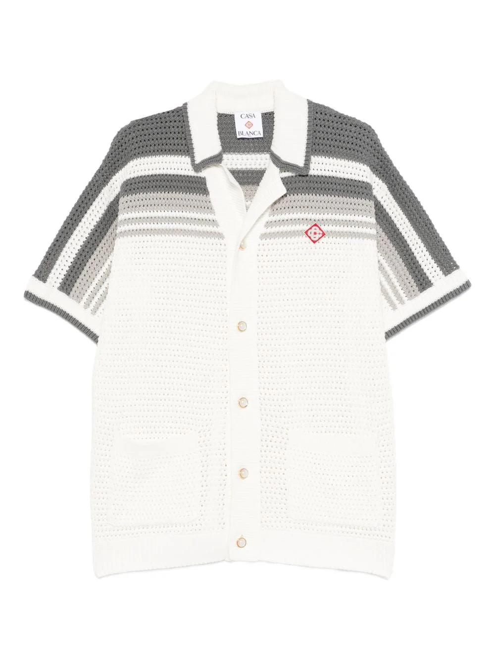 ELEVATE YOUR CASUAL WARDROBE WITH THIS EXPERTLY CRAFTED STRIPED CROCHET SHIRT. FEATURING A SOPHISTICATED WHITE AND GREY STRIPE PATTERN, THIS PIECE COMBINES TEXTURE AND STYLE WITH ITS INTRICATE CROCHET CONSTRUCTION. THE CAMP COLLAR ADDS A VINTAGE-INSPIRED TOUCH, WHILE SHORT SLEEVES KEEP IT SEASONALLY VERSATILE. PRACTICAL CHEST POCKETS AND A BRANDED LOGO PATCH PROVIDE FUNCTIONAL DETAIL, AND BUTTON FASTENING ENSURES AN EASY, POLISHED FIT. PERFECT FOR LAYERING OR WEARING STANDALONE, THIS SHIRT BRIDGES THE GAP BETWEEN RELAXED COMFORT AND REFINED TAILORING.
