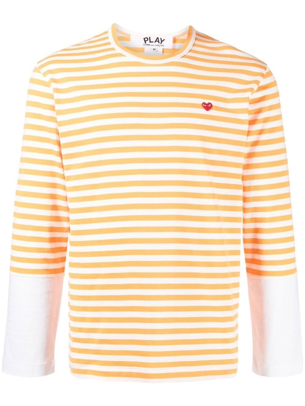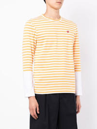 LONG-SLEEVE STRIPED T-SHIRT FROM COMME DES GARCONS PLAY FEATURING YELLOW, WHITE, COTTON, HORIZONTAL STRIPE PATTERN, SIGNATURE HEART PATCH, LONG SLEEVES, ROUND NECK AND STRAIGHT HEM.