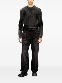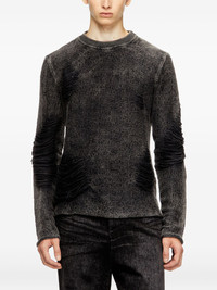 THIS BLACK SWEATER FEATURES A DISTRESSED DESIGN WITH FRAYED EDGES THAT ADD A MODERN, EDGY TOUCH. CRAFTED FROM SOFT COTTON, IT OFFERS COMFORTABLE WEAR WHILE MAINTAINING DURABILITY. THE LONG SLEEVES AND CLASSIC CREW NECK PROVIDE TIMELESS STYLE, MAKING IT A VERSATILE PIECE FOR LAYERING OR STANDALONE WEAR IN BOTH CASUAL AND FASHION-FORWARD WARDROBES.