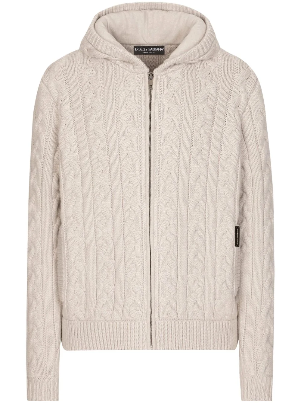EXPERTLY CRAFTED FROM A LIGHT BEIGE VIRGIN WOOL-CASHMERE BLEND, THIS CABLE-KNIT HOODIE IS THE PERFECT BLEND OF COMFORT AND STYLE. WITH A CLASSIC HOOD AND LOGO PATCH, IT FEATURES A FRONT ZIP FASTENING, SLIP POCKETS, AND RIBBED TRIM FOR A STYLISH AND PRACTICAL FINISH. STAY WARM AND ON-TREND WITH THIS MUST-HAVE PIECE.