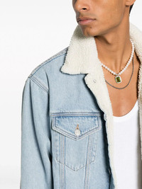 X LEVI'S SHERPA TRUCKER DENIM JACKET FROM ERL FEATURING LIGHT BLUE, COTTON, DENIM, EMBROIDERED LOGO TO THE FRONT, FAUX SHEARLING, CONTRASTING COLLAR, FRONT BUTTON FASTENING, LONG SLEEVES, BUTTONED CUFFS, TWO SIDE WELT POCKETS, TWO CHEST FLAP POCKETS, STRAIGHT HEM AND FAUX-SHEARLING LINING.