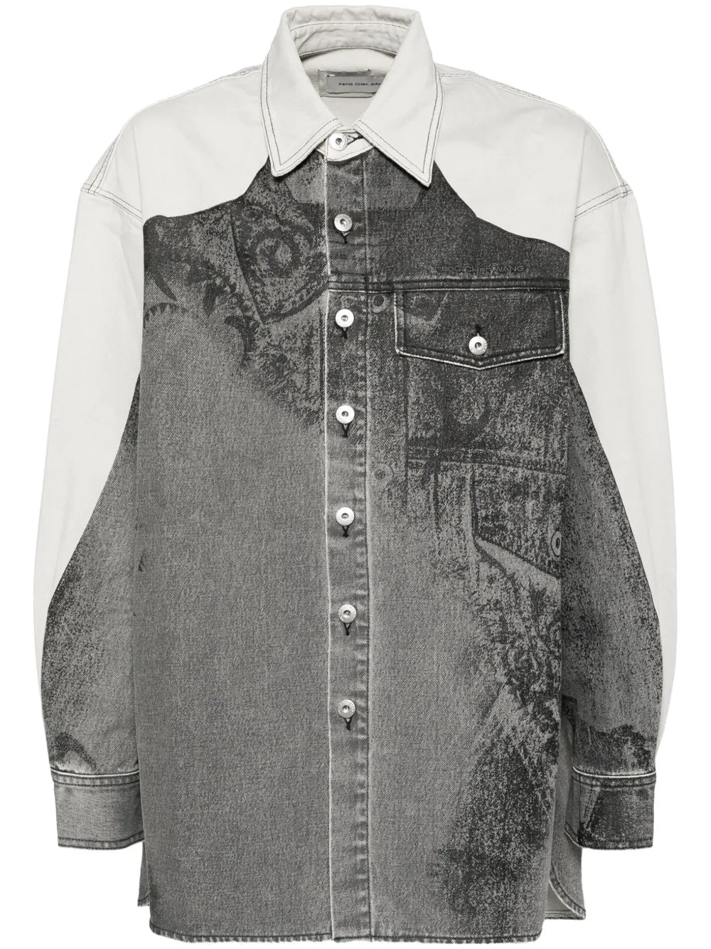 INTRODUCE SOPHISTICATION TO YOUR WARDROBE WITH OUR PRINTED DENIM JACKET. CRAFTED IN BLACK AND GREY COTTON, THE TROMPE L'OEIL PRINT AND EMBROIDERED LOGO ADD A TOUCH OF SLEEKNESS. THE DROP SHOULDER, HIGH-LOW HEM, AND FRONT BUTTON FASTENING PROVIDE A COMFORTABLE YET TRENDY FIT. PERFECT FOR CASUAL OUTINGS OR A NIGHT ON THE TOWN.
