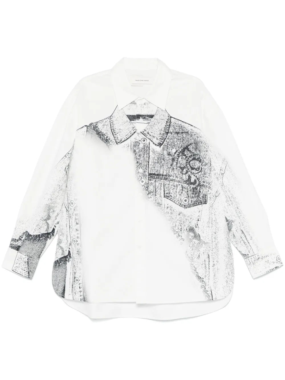 EXPERTLY BLENDING CLASSIC AND CONTEMPORARY STYLES, OUR TROMPE L'OEIL-PRINT SHIRT IS A MUST-HAVE FOR ANY WARDROBE. MADE FROM SOFT AND BREATHABLE WHITE COTTON POPLIN, IT FEATURES A UNIQUE TROMPE L'OEIL PRINT AND AN EMBROIDERED LOGO ON THE CHEST. THE DROP SHOULDER, BOX-PLEAT DETAIL, AND HIGH-LOW HEM ADD A MODERN TWIST TO THIS TIMELESS PIECE. PERFECT FOR ANY OCCASION WITH ITS FRONT BUTTON FASTENING AND CLASSIC COLLAR.