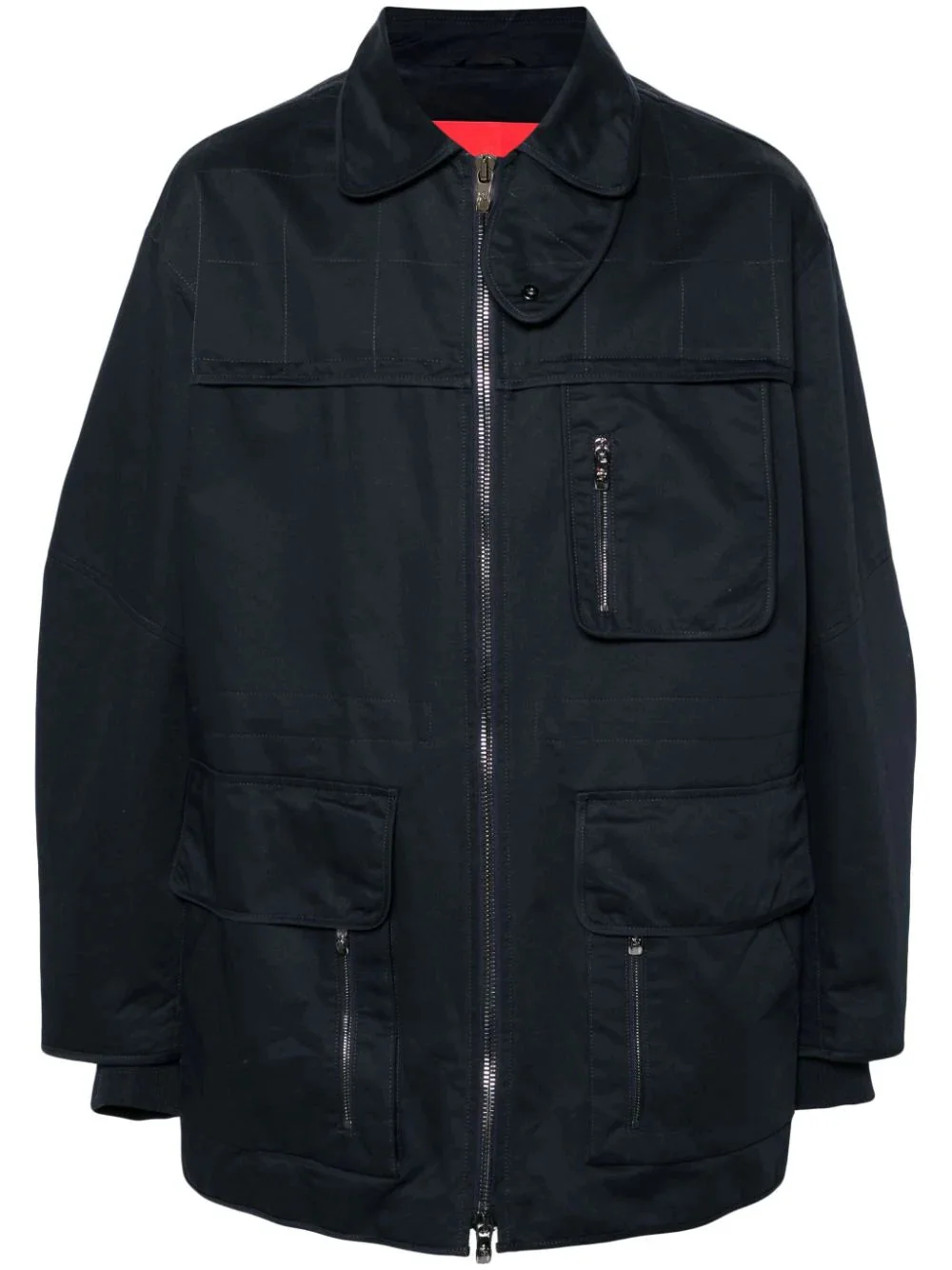 NAVY BLUE COTTON TWILL WEAVE QUILTED SPREAD COLLAR THROAT LATCH FRONT TWO-WAY ZIP FASTENING LONG SLEEVES RIBBED CUFFS ZIP-FASTENING CHEST POCKET TWO SIDE CARGO POCKETS TWO SIDE ZIP-FASTENING POCKETS TWO DIAGONAL POCKETS TO THE SIDES LOGO-JACQUARD LINING STRAIGHT HEM