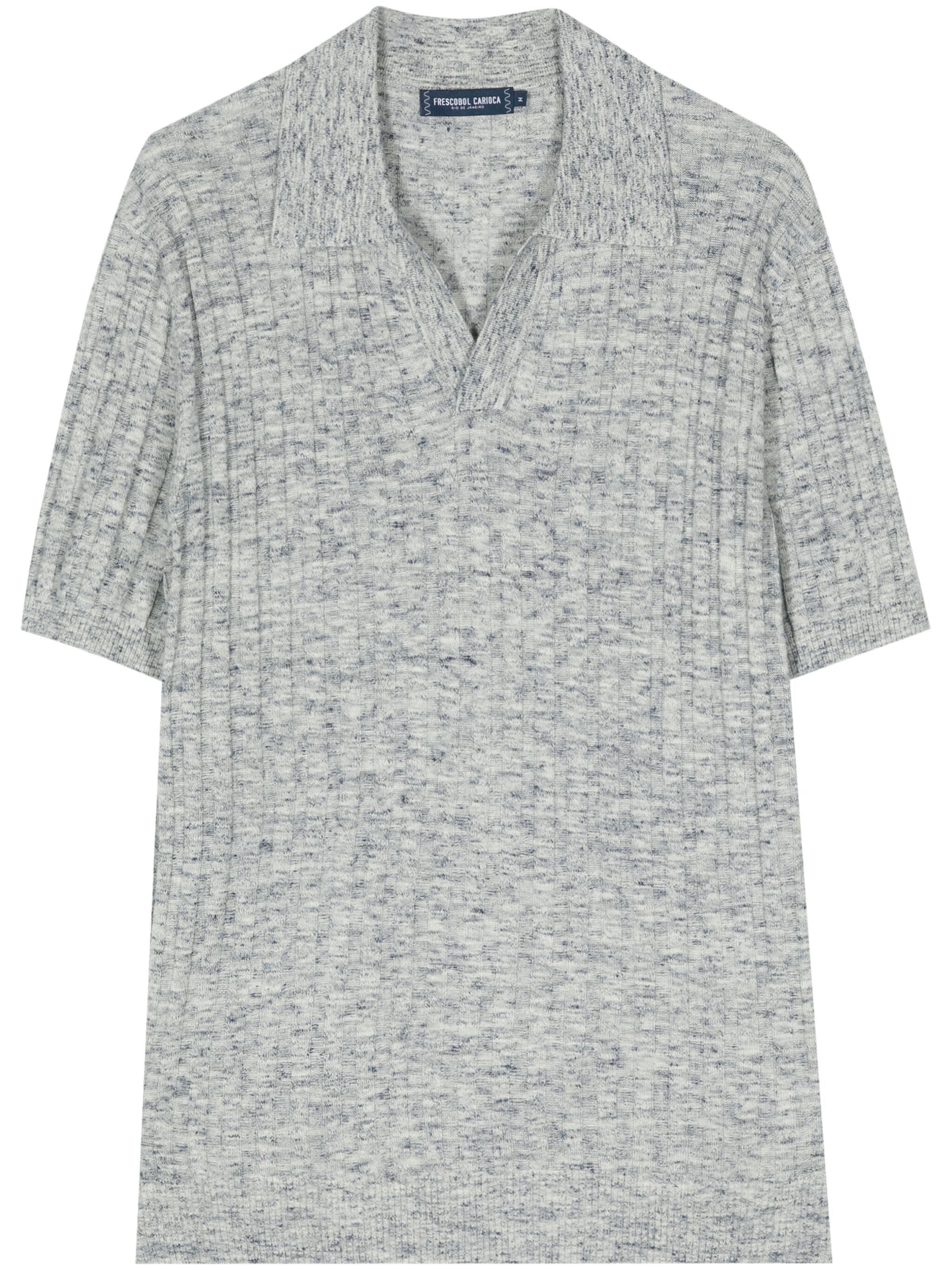 BLUE-GREY COTTON-LINEN BLEND MELANGE EFFECT RIBBED KNIT POLO COLLAR SHORT BUTTONLESS PLACKET SHORT SLEEVES STRAIGHT HEM