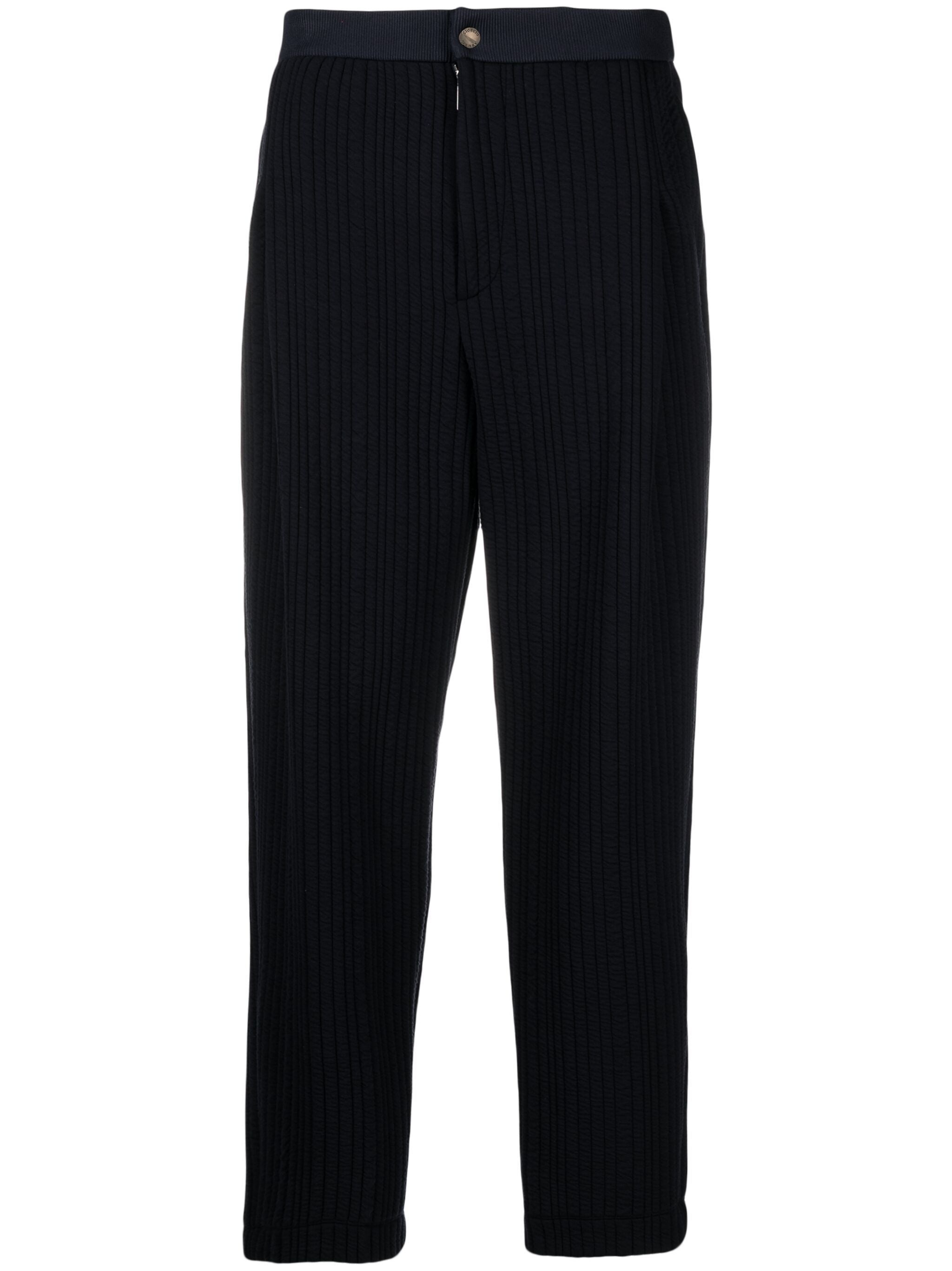 NAVY BLUE FULLY PLEATED QUILTED RIBBED WAISTBAND FRONT PRESS-STUD AND ZIP FASTENING WIDE TAPERED LEG TWO SIDE INSET POCKETS TWO REAR WELT POCKETS COTTON LINING