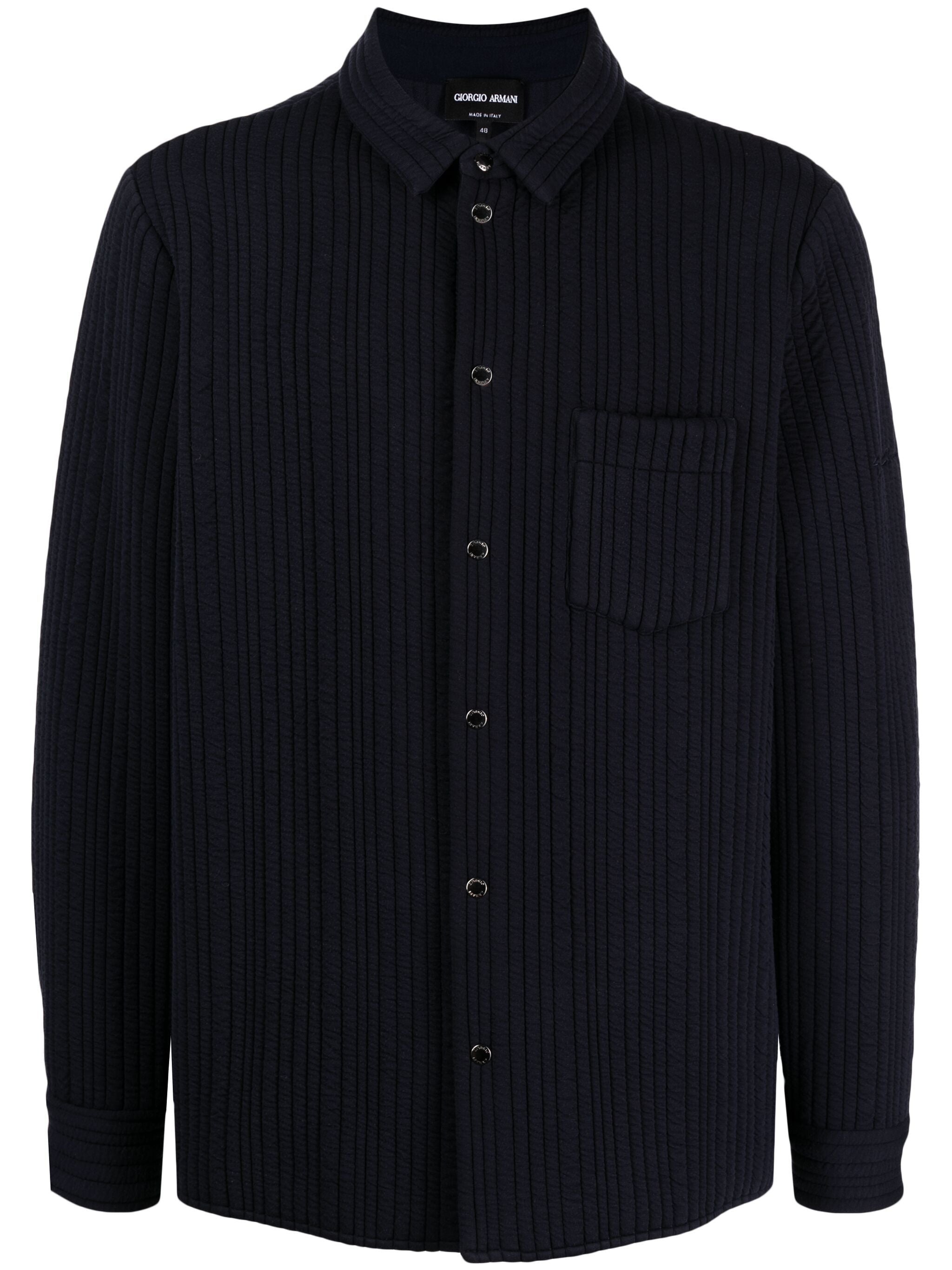 EXPERTLY CRAFTED WITH A MIDNIGHT BLUE QUILTED DESIGN, THIS PRESS-STUD SHIRT FEATURES A CLASSIC COLLAR AND LONG SLEEVES WITH BUTTONED CUFFS. THE CHEST PATCH POCKET AND CURVED HEM ADD BOTH FUNCTIONALITY AND STYLE. SECURE AND STYLISH, THIS SHIRT IS A MUST-HAVE FOR ANY WARDROBE.