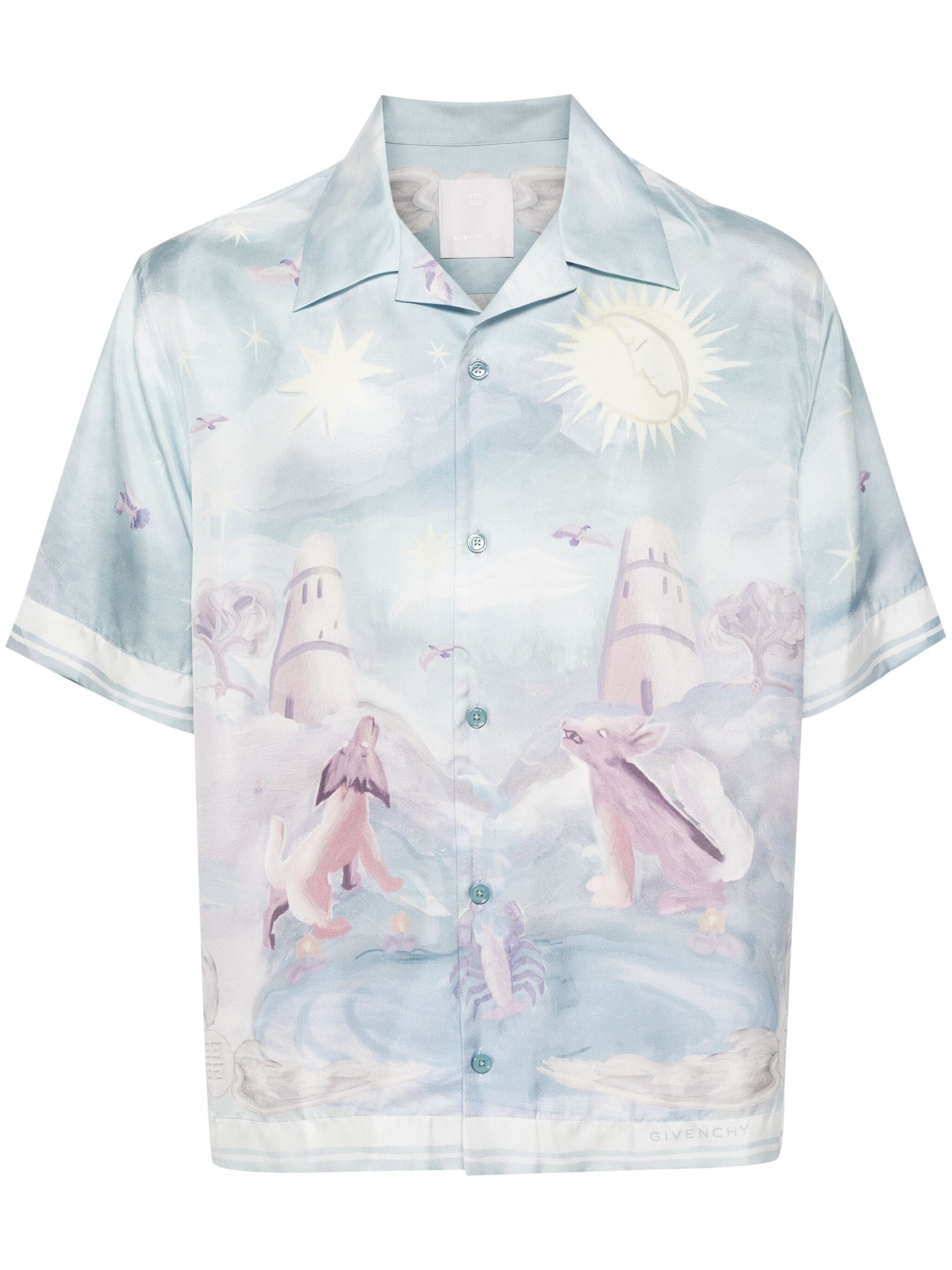 BLUE/MULTICOLOUR SILK FRONT BUTTON FASTENING GRAPHIC PRINT CUBAN COLLAR SHORT SLEEVES SHORT SIDE SLITS STRAIGHT HEM