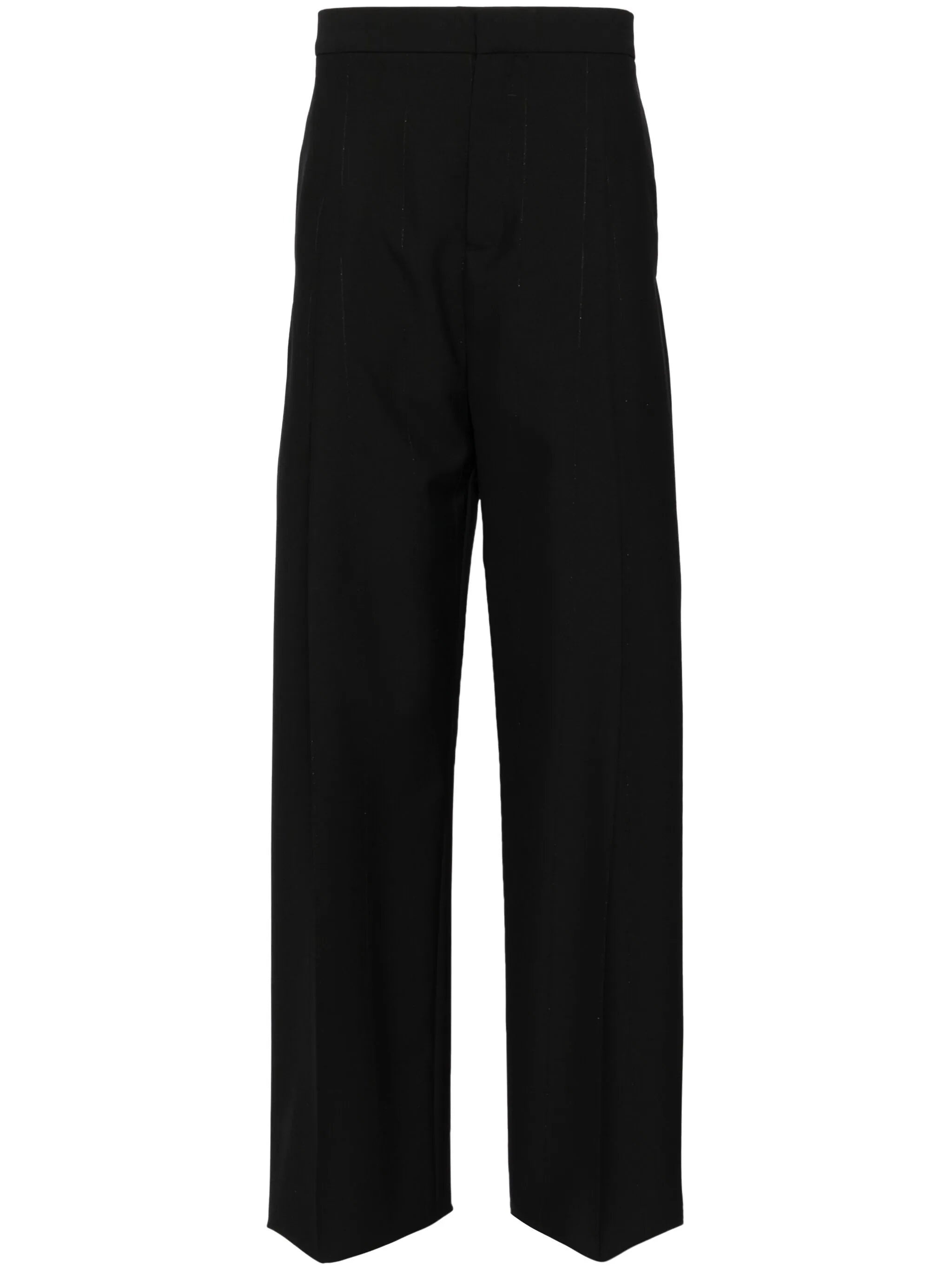 BLACK WOOL BLEND PLEAT DETAILING HOOK AND ZIP FLY FASTENING TWO SIDE INSET POCKETS STITCHED POCKETS STRAIGHT HEM