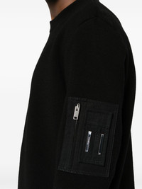 BLACK WOOL KNITTED CONSTRUCTION SLEEVE ZIP POCKET CREW NECK LONG SLEEVES RIBBED TRIM SILVER-TONE HARDWARE STRAIGHT HEM