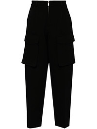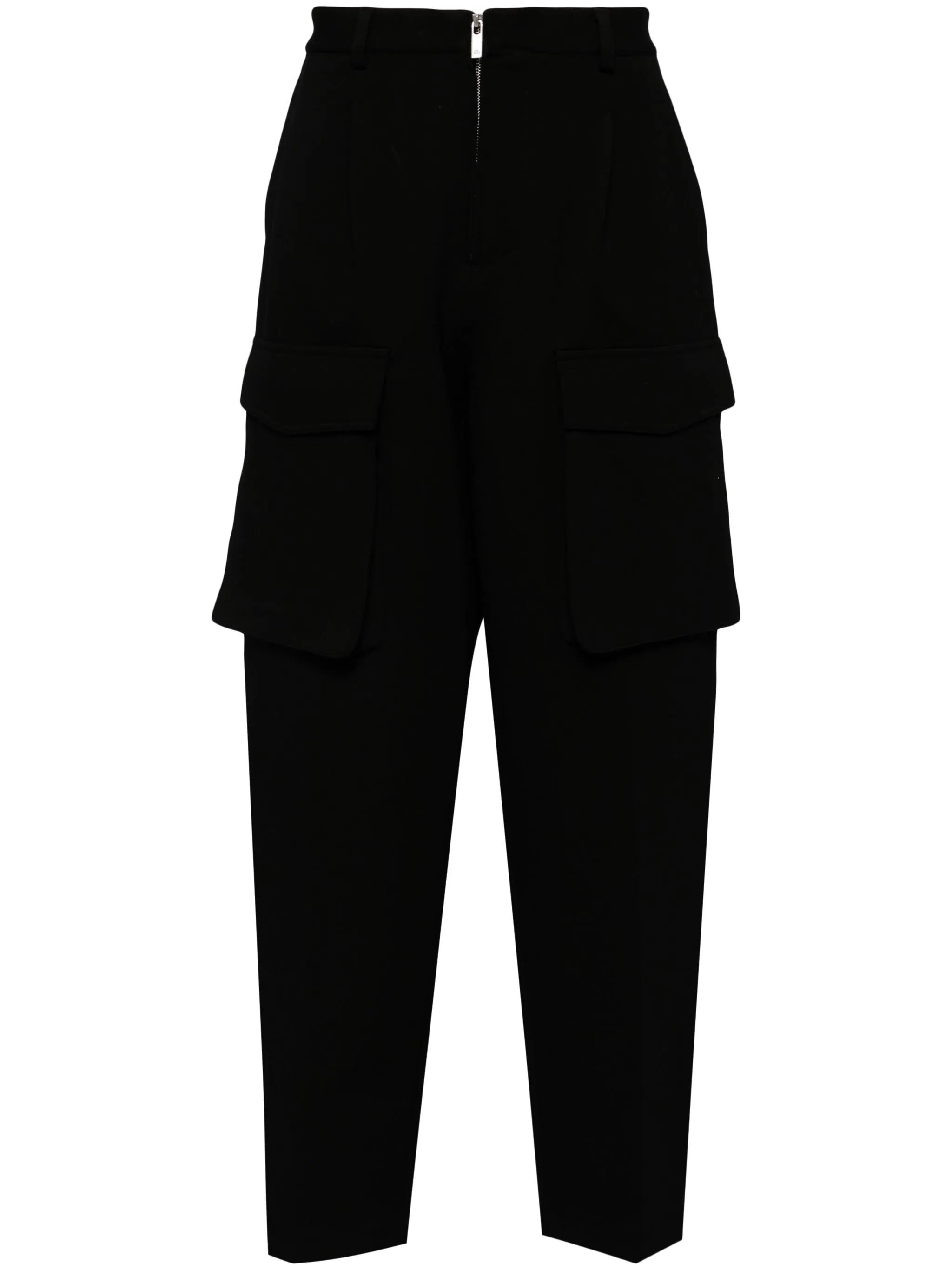 BLACK STRETCH-DESIGN TAPERED LEG FRONT ZIP FASTENING BELT LOOPS BRANDED ZIP PULLER PLEAT DETAILING TWO FRONT FLAP POCKETS TWO REAR PATCH POCKETS SILVER-TONE LOGO PLAQUE ANKLE ZIPS