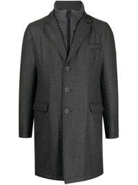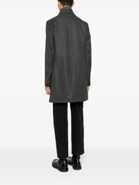EXPERTLY CRAFTED FROM A LUXURIOUS DARK GREY VIRGIN WOOL-CASHMERE BLEND, THIS HYBRID COAT FEATURES A HIGH NECK, NOTCHED LAPELS, AND A FRONT BUTTON AND ZIP FASTENING FOR A SLEEK AND SOPHISTICATED LOOK. WITH TWO FRONT FLAP POCKETS, A CHEST WELT POCKET, AND BUTTONED CUFFS, THIS COAT COMBINES FUNCTIONALITY AND STYLE FOR THE MODERN PROFESSIONAL.