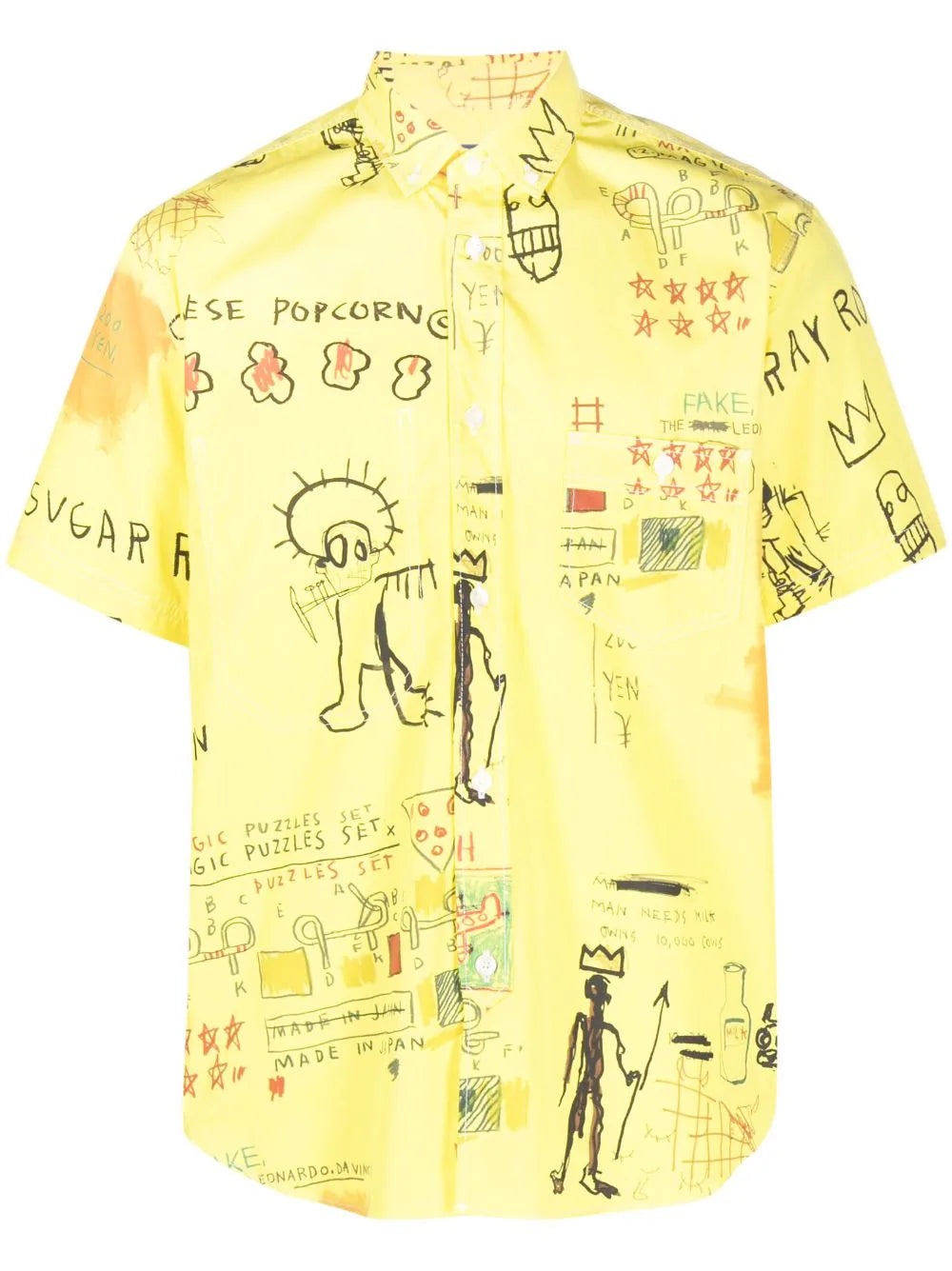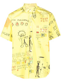 ILLUSTRATION-PRINT COTTON SHIRT FROM JUNYA WATANABE FEATURING CANARY YELLOW, COTTON, ILLUSTRATION-STYLE PRINT, CLASSIC COLLAR, FRONT BUTTON FASTENING, SHORT SLEEVES AND CURVED HEM.