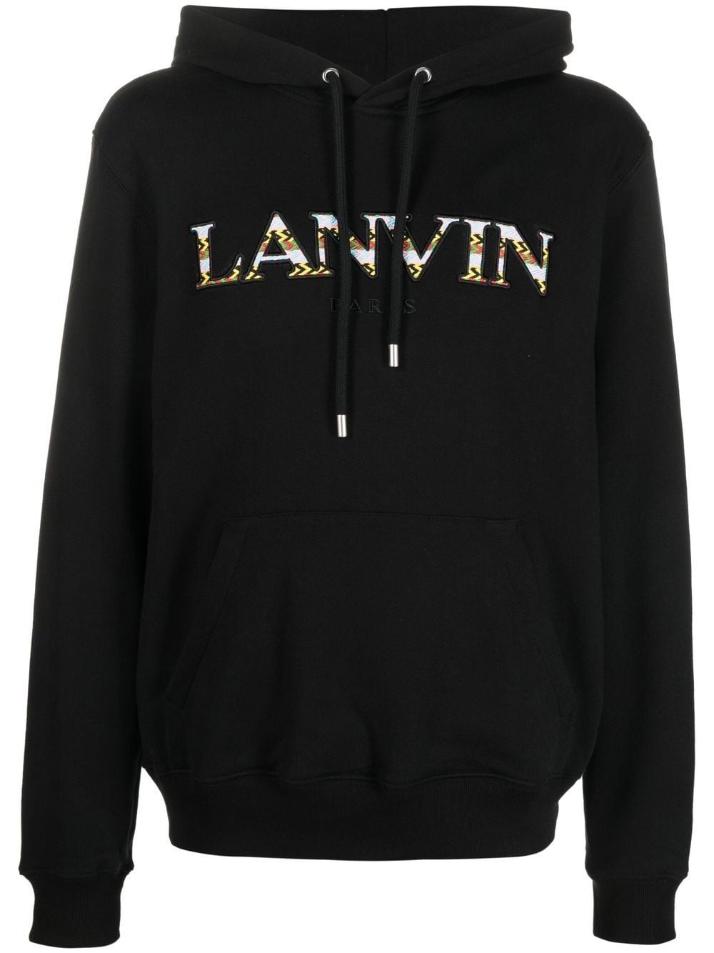 EMBROIDERED-LOGO POUCH-POCKET HOODIE FROM LANVIN FEATURING BLACK/MULTICOLOUR, COTTON, JERSEY FLEECE, EMBROIDERED LOGO TO THE FRONT, DRAWSTRING HOOD, LONG SLEEVES, FITTED-CUFF SLEEVES, FRONT POUCH POCKET AND STRAIGHT HEM.