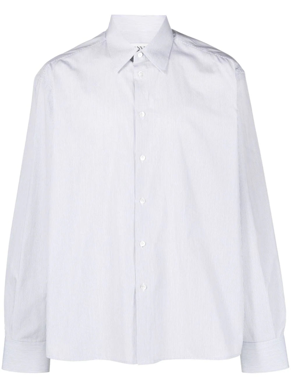 PINSTRIPE-PRINT COTTON SHIRT FROM LANVIN FEATURING WHITE, COTTON, POPLIN TEXTURE, PINSTRIPE PRINT, CLASSIC COLLAR, FRONT BUTTON FASTENING, LONG SLEEVES, BUTTONED CUFFS AND STRAIGHT HEM.
