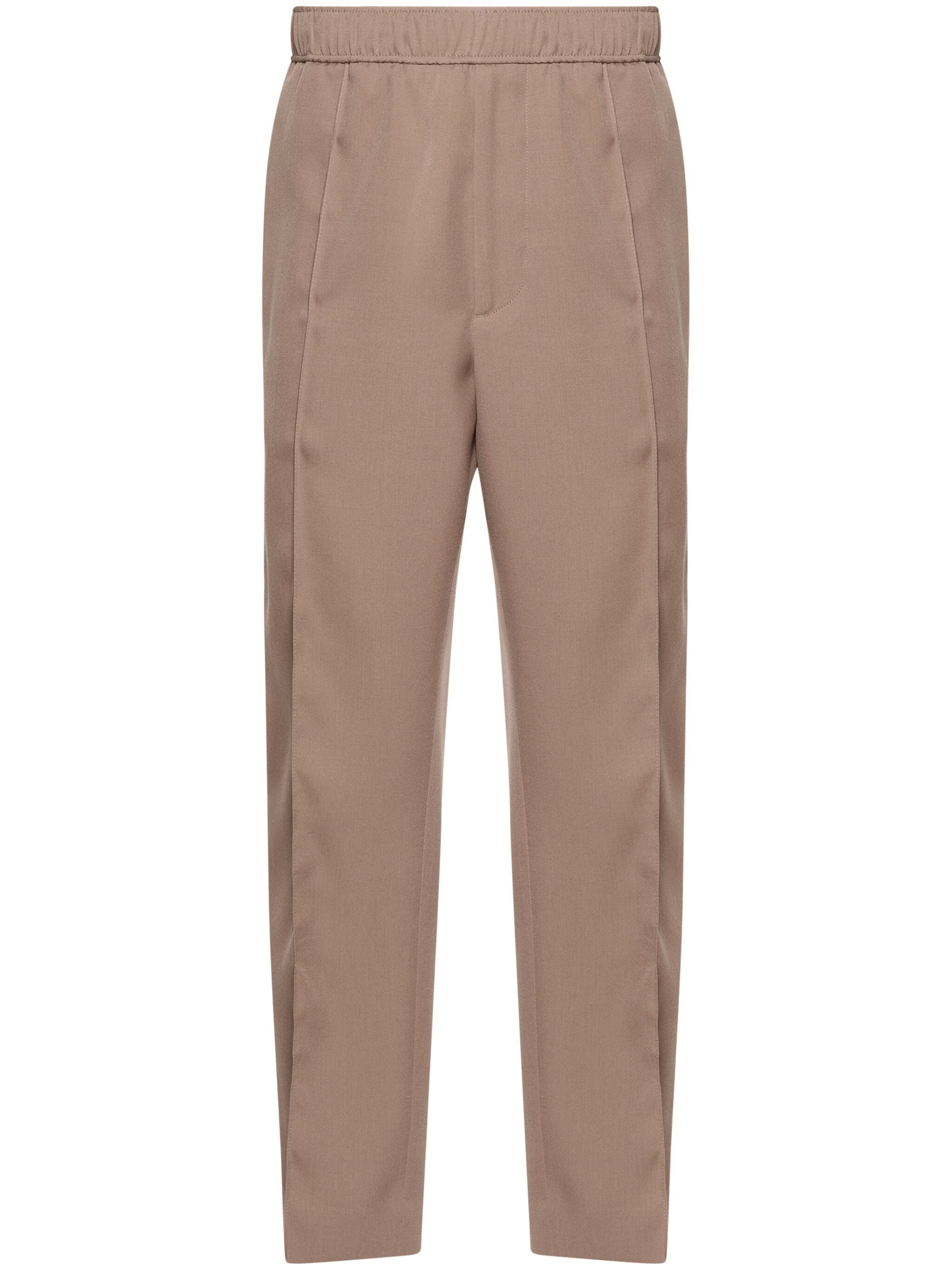UPGRADE YOUR WARDROBE WITH OUR WOOL TROUSERS. MADE OF PREMIUM TOBACCO BROWN WOOL, THESE TROUSERS FEATURE A COMFORTABLE ELASTICATED WAISTBAND WITH AN INTERNAL DRAWSTRING FOR A PERFECT FIT. THE RAISED SEAM DETAIL ADDS A TOUCH OF SOPHISTICATION, WHILE THE MULTIPLE POCKETS PROVIDE CONVENIENT STORAGE. LOOK STYLISH AND FEEL AT EASE ALL DAY LONG IN OUR STRAIGHT LEG TROUSERS.