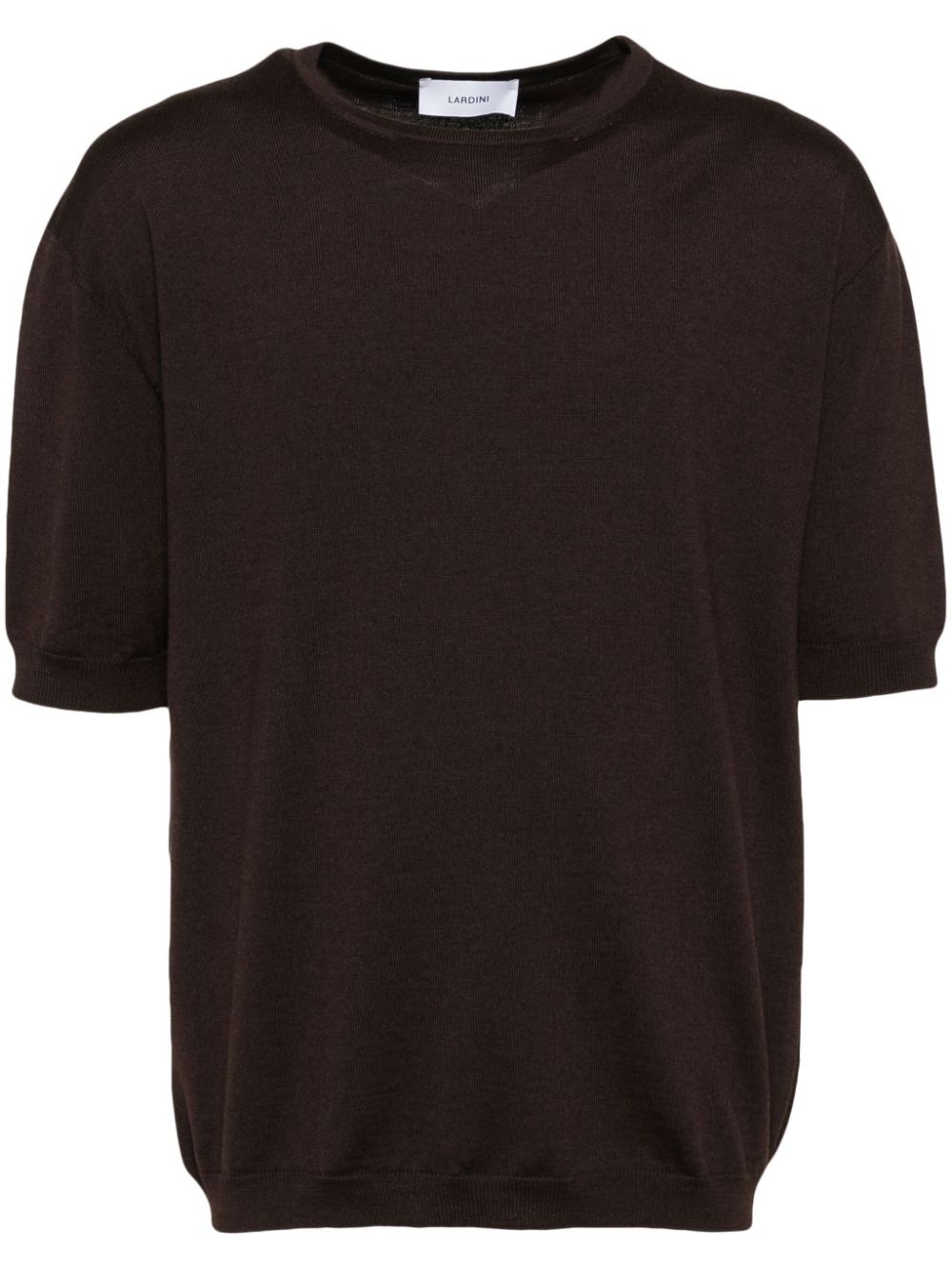 THIS KNITTED T-SHIRT IS MADE FROM A HIGH-QUALITY COFFEE BROWN WOOL BLEND, ENSURING A COMFORTABLE AND DURABLE WEAR. THE CREW NECK AND SHORT SLEEVES ADD A MODERN TOUCH, WHILE THE RIBBED CUFFS AND HEM PROVIDE A PERFECT FIT. A MUST-HAVE FOR ANY WARDROBE.