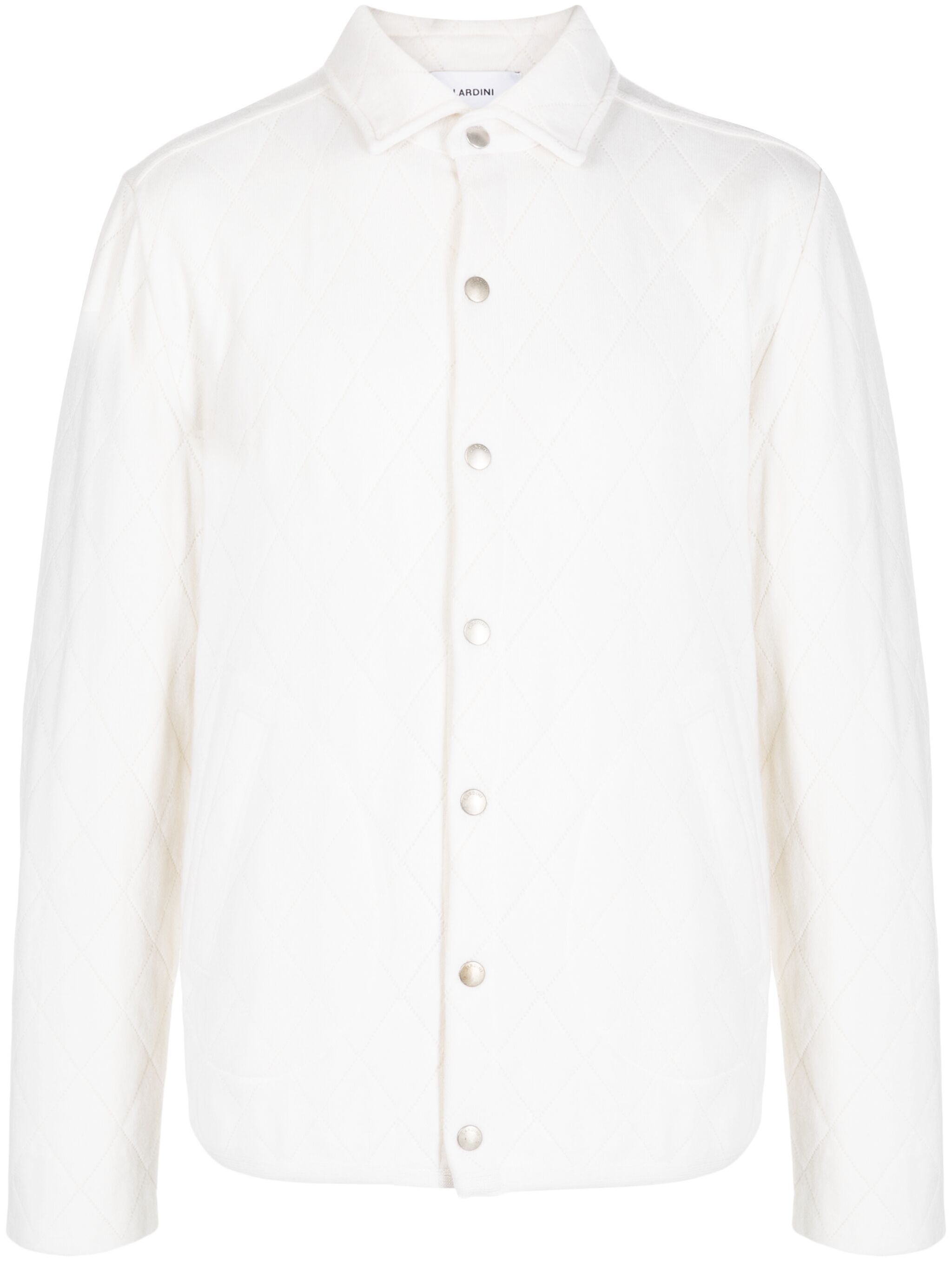 WHITE WOOL BLEND POINTELLE KNIT FRONT PRESS-STUD FASTENING SLIP POCKETS TO THE SIDES CLASSIC COLLAR LONG SLEEVES STRAIGHT HEM