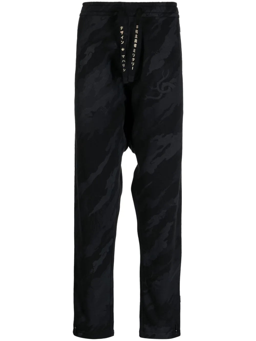 BLACK ORGANIC COTTON CAMOUFLAGE PATTERN DROP CROTCH ELASTICATED DRAWSTRING WAISTBAND DRAWSTRING ANKLES STRAIGHT LEG TWO SIDE INSET POCKETS REAR BUTTON-FASTENING POCKET THIS ITEM IS MADE FROM AT LEAST 50% ORGANIC MATERIALS.