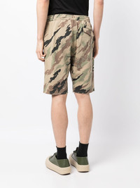 BONSAI FOREST-PRINT COTTON SHORTS FROM MAHARISHI FEATURING KHAKI, MULTICOLOUR, ORGANIC COTTON, CAMOUFLAGE PATTERN, RAW-CUT HEM, KNEE-LENGTH, TWO SIDE INSET POCKETS, REAR FLAP POCKET AND ELASTICATED DRAWSTRING WAISTBAND.