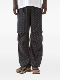 THESE NAVY GEOMETRIC-PATTERN TRACK PANTS ARE CRAFTED FROM COTTON FOR BREATHABLE COMFORT. FEATURING A DRAWSTRING WAIST FOR AN ADJUSTABLE FIT AND SIDE POCKETS FOR CONVENIENCE, THEY COMBINE STYLE WITH PRACTICALITY FOR EVERYDAY WEAR.