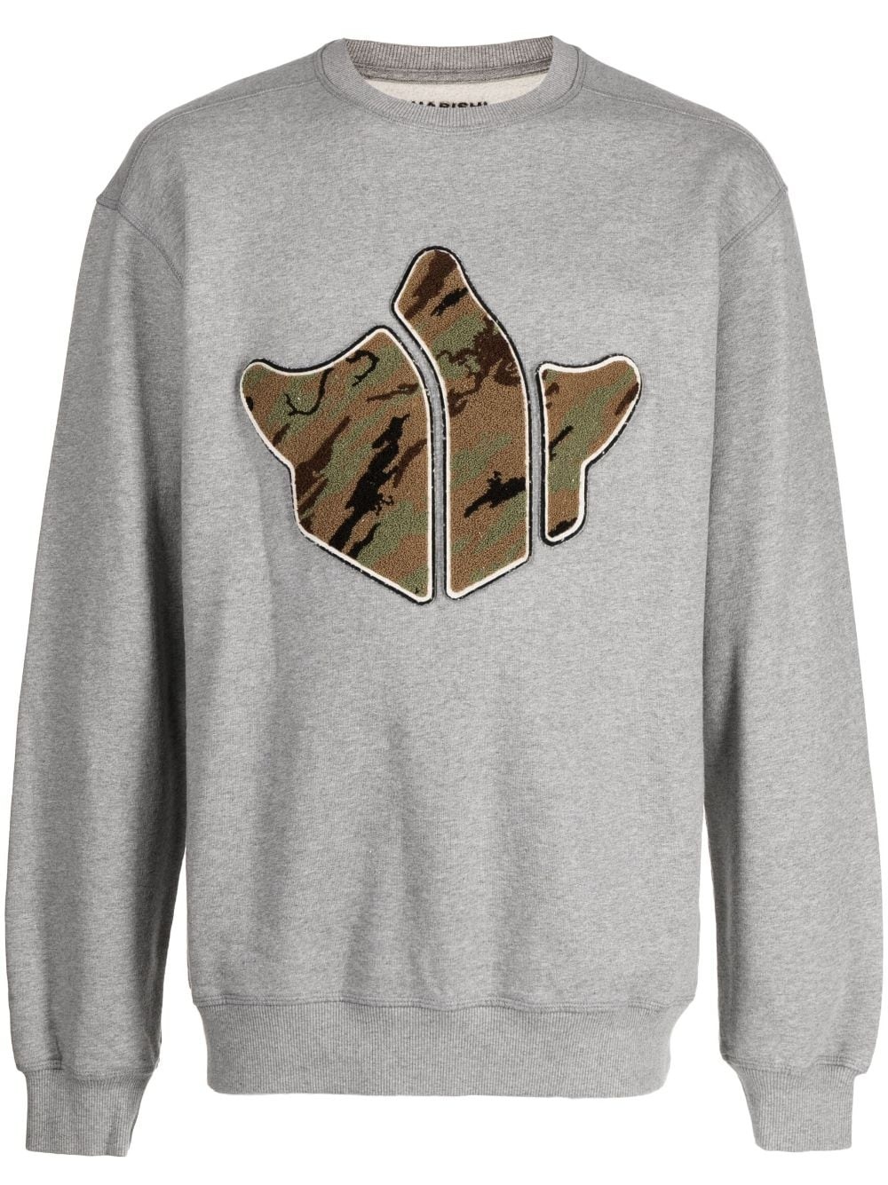 MAHA TEMPLE COTTON SWEATSHIRT FROM MAHARISHI FEATURING GREY, MULTICOLOUR, ORGANIC COTTON, JERSEY KNIT, CHENILLE LOGO PATCH, LOGO PATCH TO THE FRONT, CREW NECK, DROP SHOULDER, LONG SLEEVES, RIBBED CUFFS AND HEM AND STRAIGHT HEM.