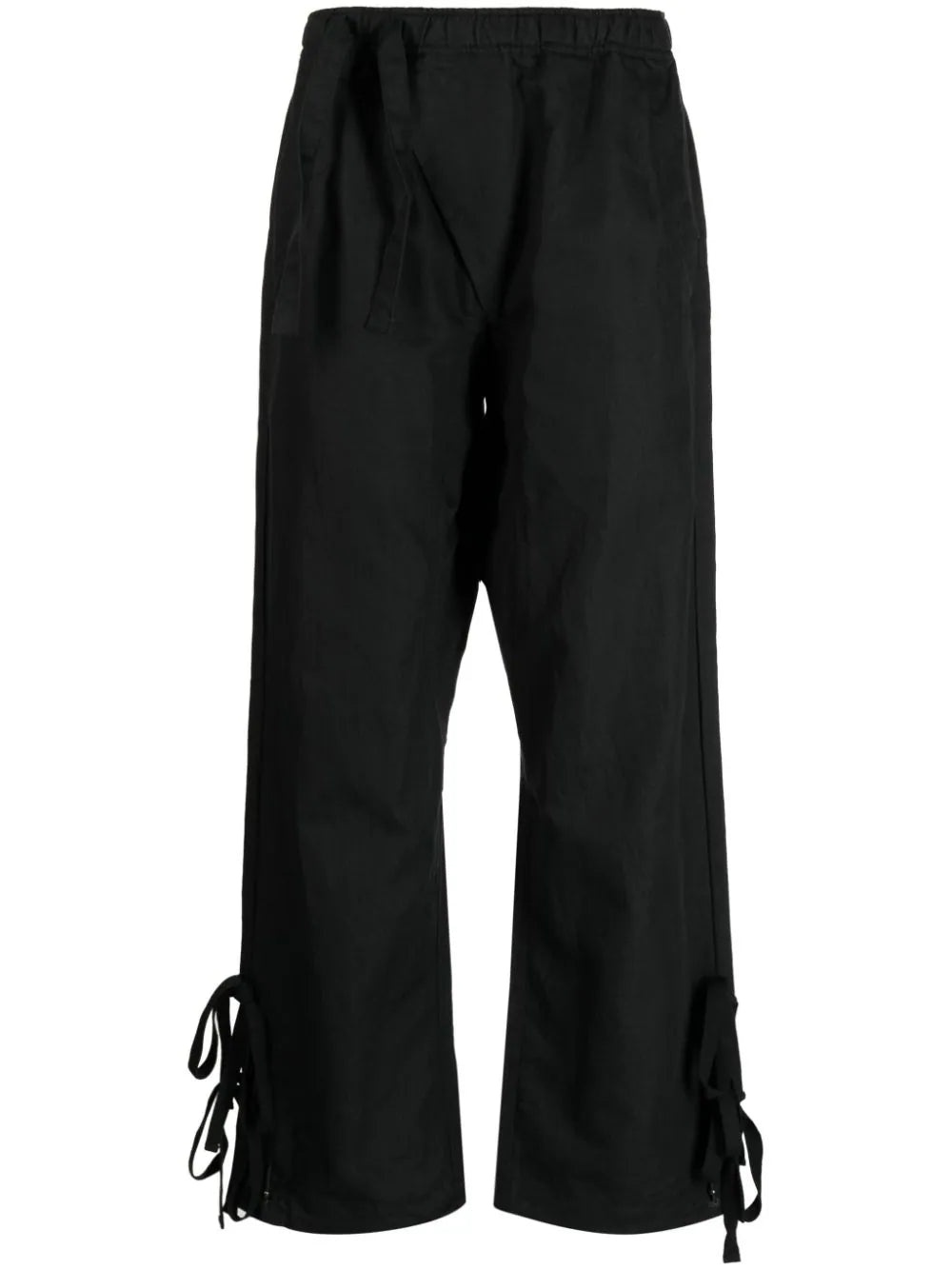 BLACK ORGANIC COTTON BLEND STRAP DETAILING ELASTICATED DRAWSTRING WAISTBAND DROP CROTCH TWO SIDE INSET POCKETS REAR FLAP POCKET STRAIGHT HEM