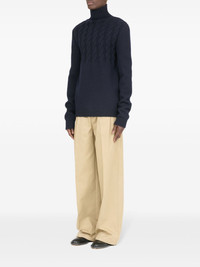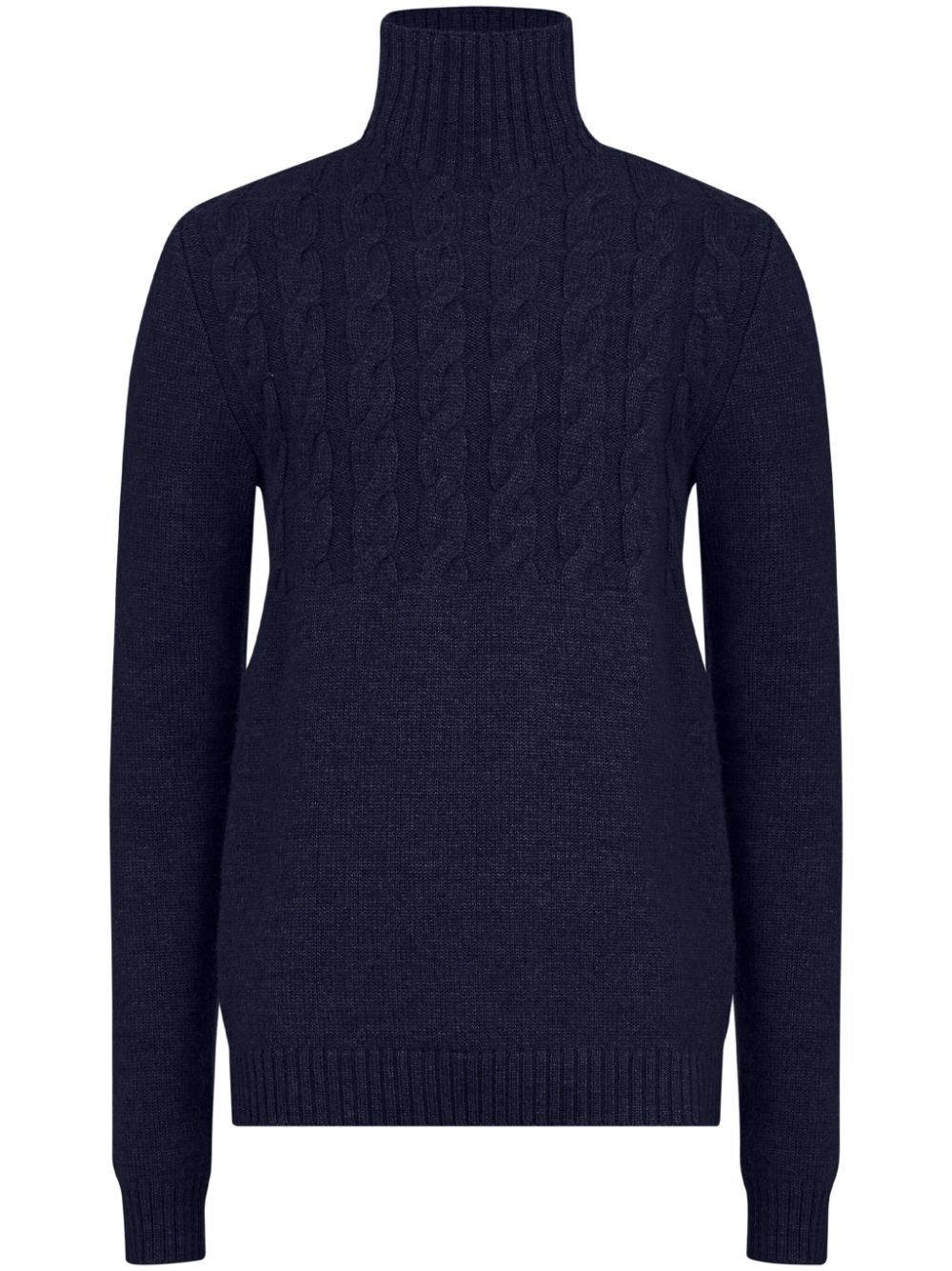 ELEVATE YOUR WINTER WARDROBE WITH OUR HIGH-NECK VIRGIN-WOOL SWEATER. MADE WITH NAVY BLUE VIRGIN WOOL, THIS CABLE KNIT SWEATER FEATURES A RIBBED EDGE AND HIGH NECK FOR ADDED WARMTH. WITH LONG SLEEVES AND A STRAIGHT HEM, IT'S BOTH STYLISH AND FUNCTIONAL. STAY COZY AND FASHIONABLE THIS SEASON.