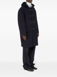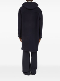 EXPERTLY CRAFTED IN NAVY BLUE WOOL, THIS HOODED WOOL COAT PROVIDES A CLASSIC YET STYLISH LOOK WITH ITS TOGGLE BUTTONS AND FRONT BUTTON FASTENING. PERFECT FOR COOLER WEATHER, ITS HOOD AND LONG SLEEVES OFFER WARMTH AND ITS TWO SIDE FLAP POCKETS PROVIDE CONVENIENCE. A MUST-HAVE FOR ANY WARDROBE.