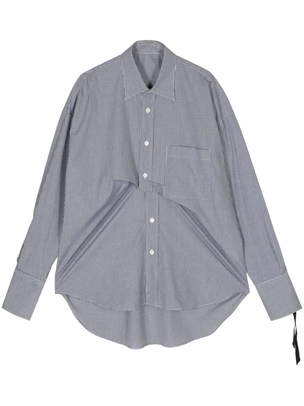 BLACK/WHITE COTTON CHECK PATTERN STRAIGHT-POINT COLLAR FRONT BUTTON FASTENING LONG SLEEVES DRAPED DESIGN CURVED HEM