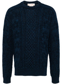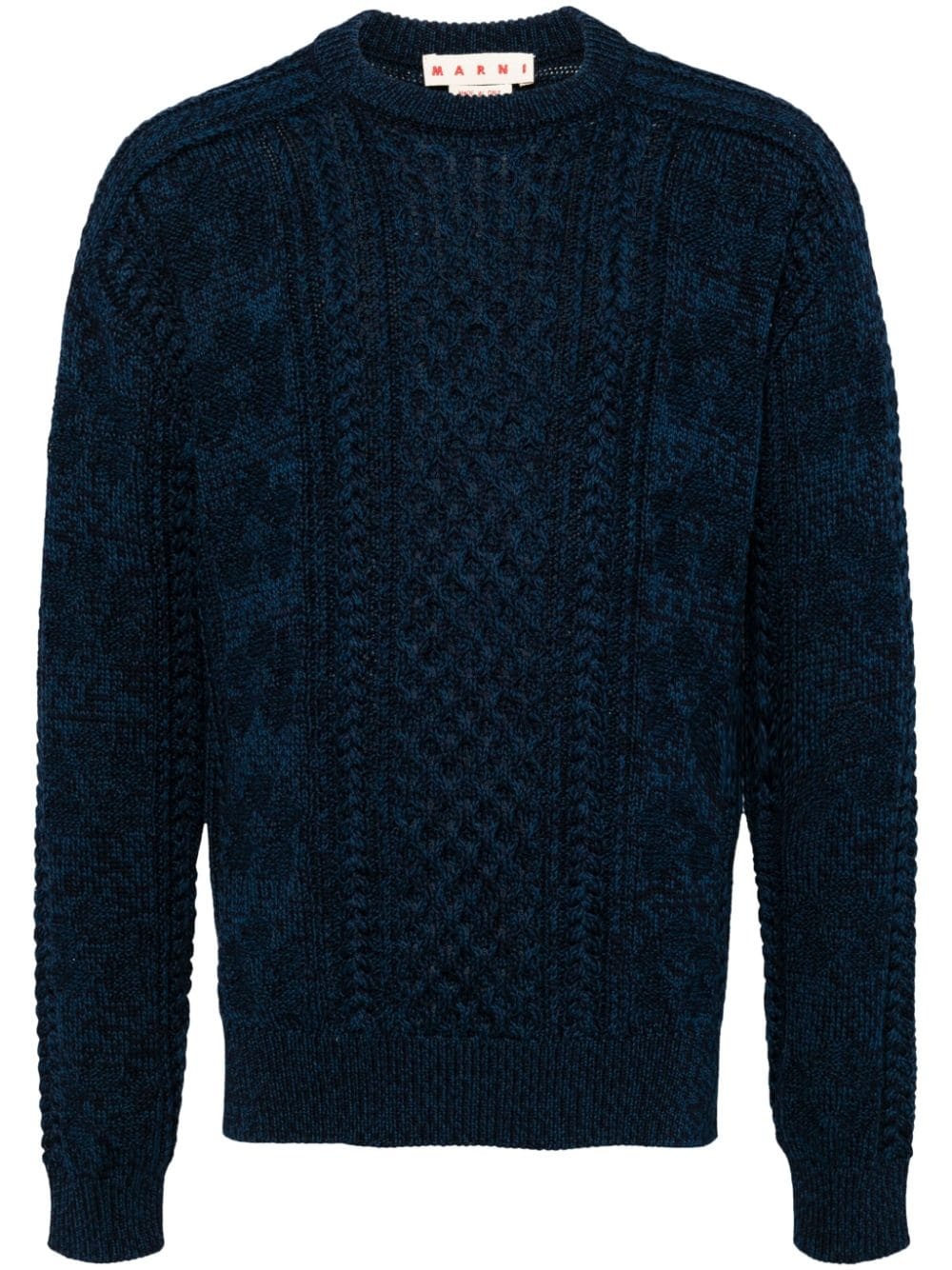 MIDNIGHT BLUE COTTON CABLE KNIT RIBBED TRIM CREW NECK LONG SLEEVES STRAIGHT HEM