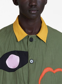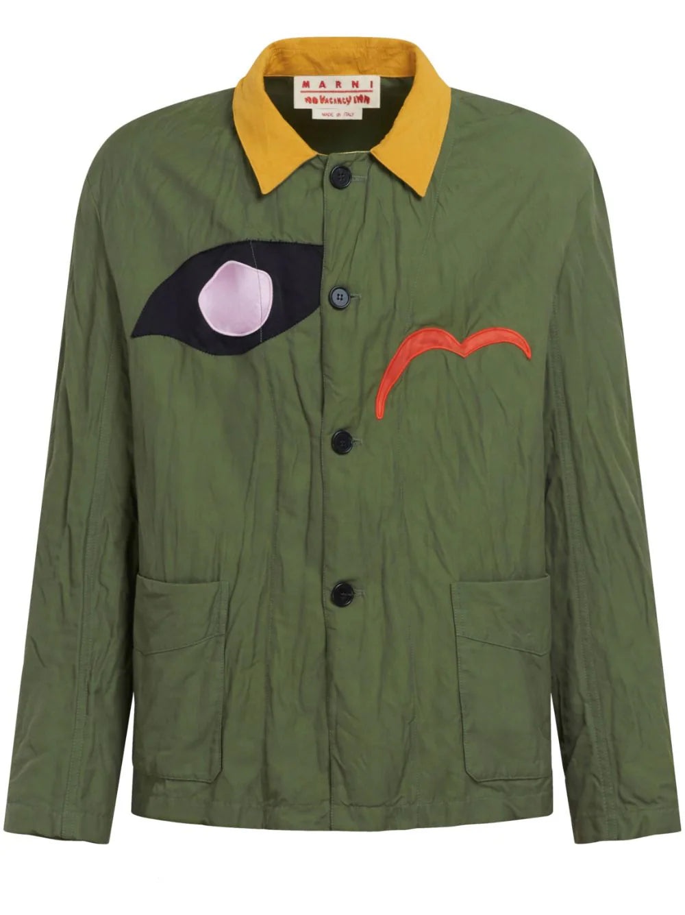 LOGO-PATCH SHIRT JACKET FROM MARNI FEATURING OLIVE GREEN, MULTICOLOUR, COTTON BLEND, LOGO PATCHES TO THE FRONT, CLASSIC COLLAR, FRONT BUTTON FASTENING, TWO FRONT PATCH POCKETS, LONG SLEEVES AND STRAIGHT HEM.