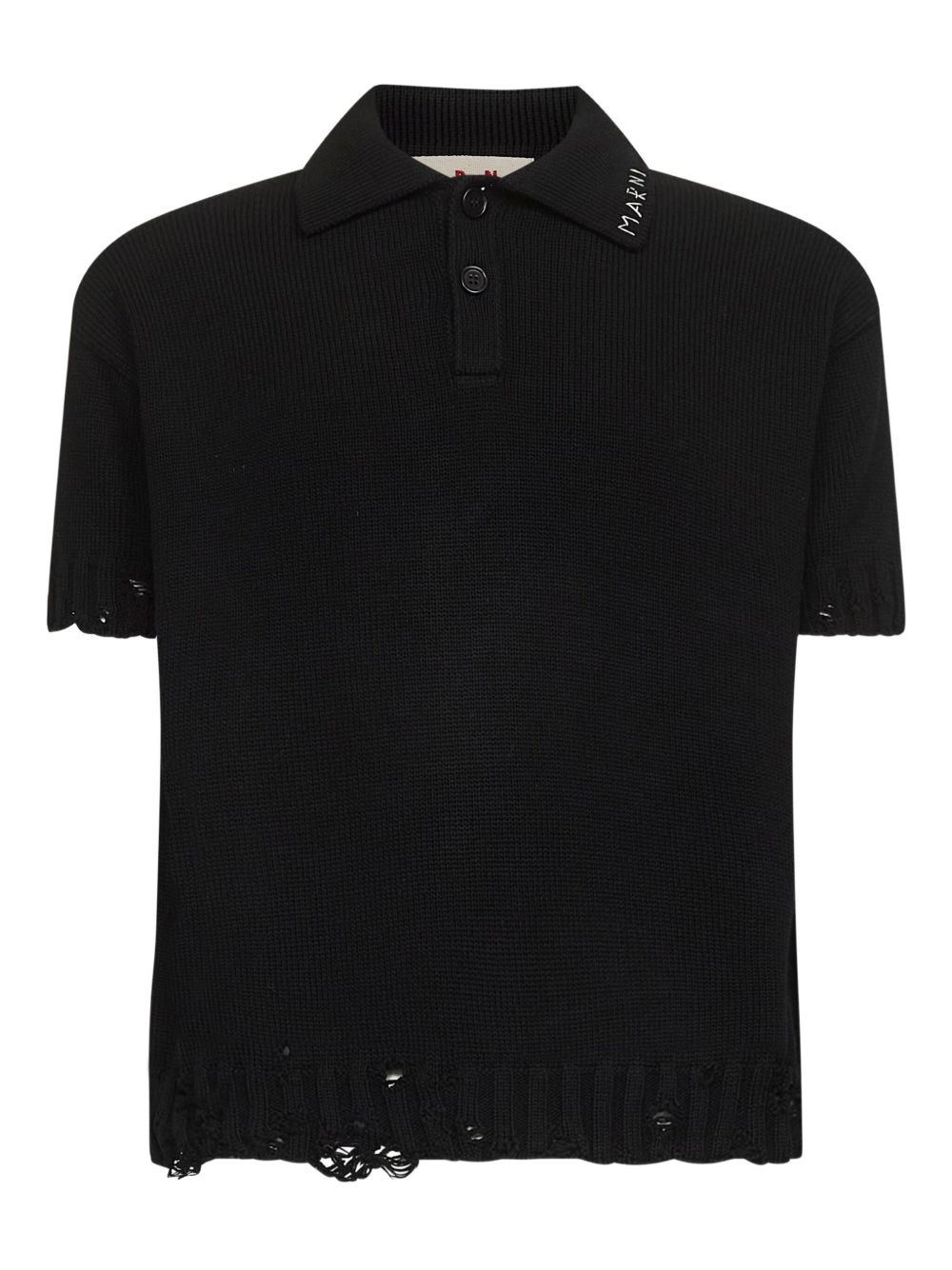 THIS BLACK POLO SHIRT FEATURES A RIBBED COLLAR AND A TWO-BUTTON PLACKET FOR A REFINED YET CASUAL LOOK. SHORT SLEEVES WITH DROPPED SHOULDERS CREATE A RELAXED FIT, COMPLEMENTED BY A DISTINCTIVE FRAYED BOTTOM BAND FOR SUBTLE EDGE. HAND-STITCHED EMBROIDERY ADDS A UNIQUE, CRAFTED DETAIL, MAKING THIS PIECE BOTH STYLISH AND EXPERTLY TAILORED FOR CONTEMPORARY WEAR.
