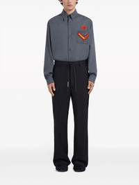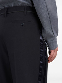BLACK VIRGIN WOOL SATIN TRIM STRAIGHT LEG MID-RISE BELT LOOPS FRONT BUTTON AND ZIP FASTENING TIED WAIST TWO SIDE INSET POCKETS TWO REAR BUTTON-FASTENING JETTED POCKETS